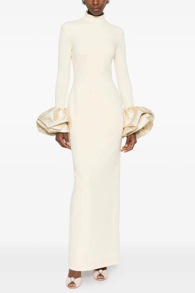 rachel white ruffled crystal-embellished crepe mock-neck gown