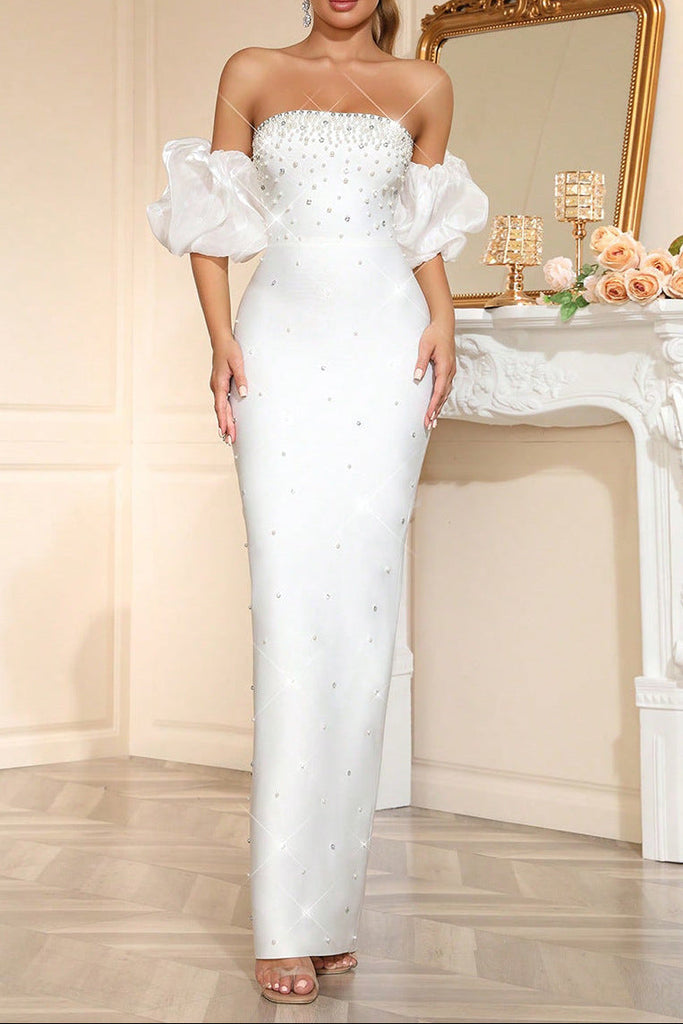 vicky black rhinestone embellished velvet puff sleeve maxi dress