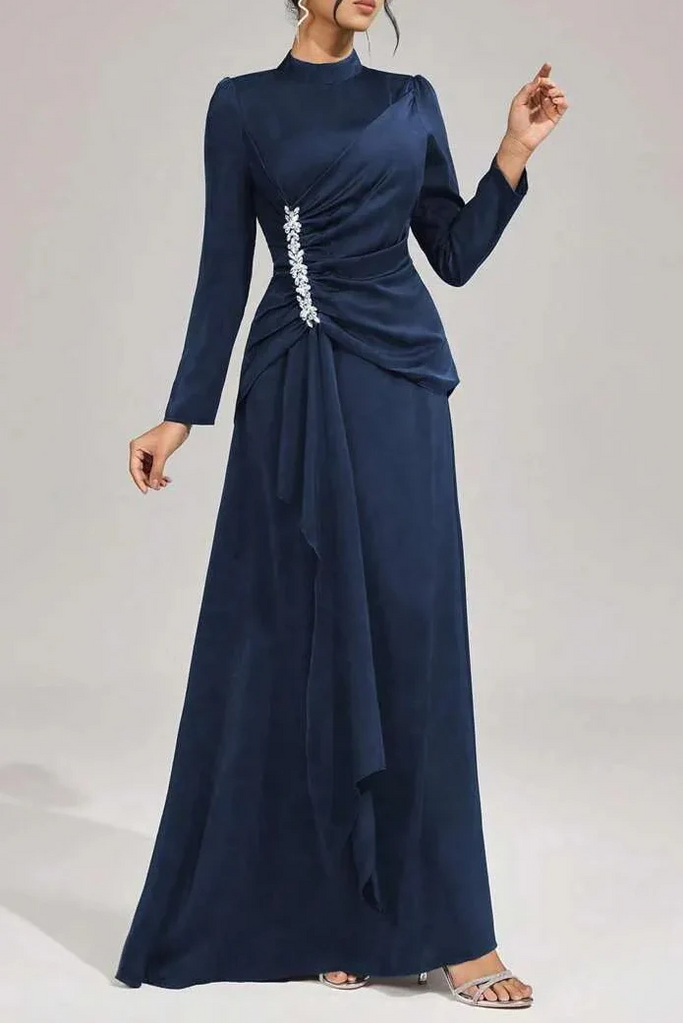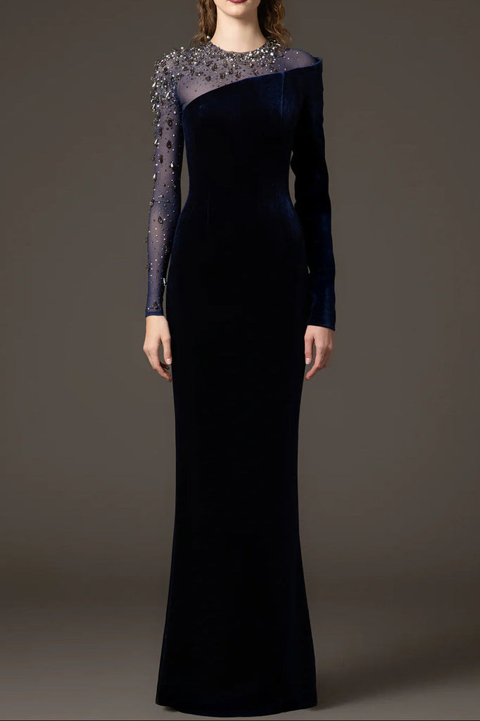 riva crystal patchwork Velvet Column maxi Dress in dark blue