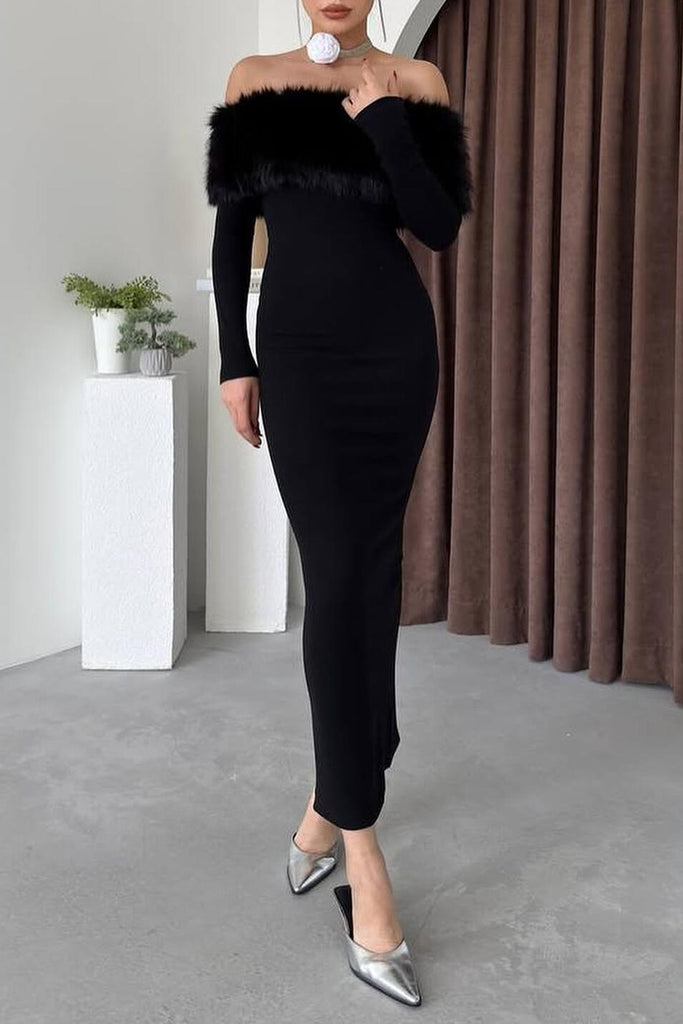 FEATHER BODYCON MAXI DRESS IN BLACK