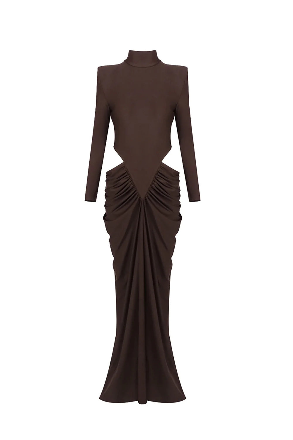 The Jacqueline Turtleneck Gown combines sophisticated tailoring with contemporary design. This bodycon silhouette features a refined turtleneck collar and extended sleeves, while strategic cutout detailing adds modern edge to the classic brown palette. The form-fitting construction accentuates your natural curves, making it an ideal choice for evening events, upscale gatherings, or statement-making occasions. Crafted for those who appreciate understated elegance with a fashion-forward twist, this gown delivers both polish and personality in one versatile piece.