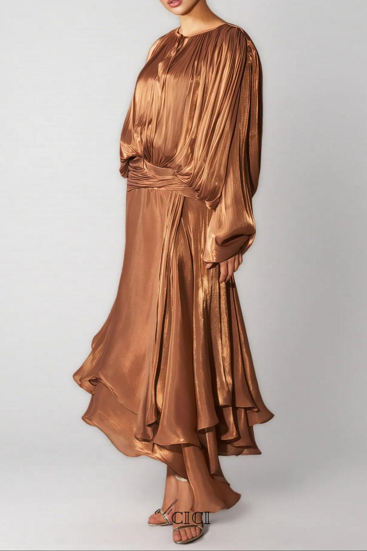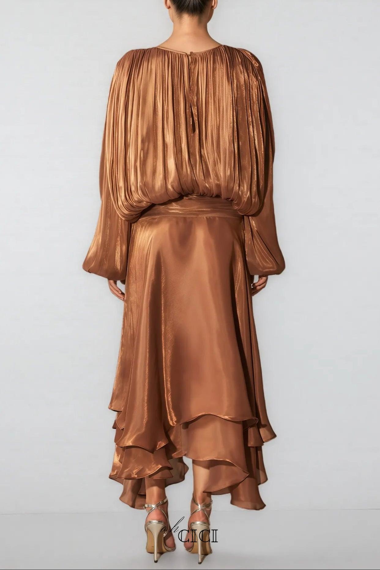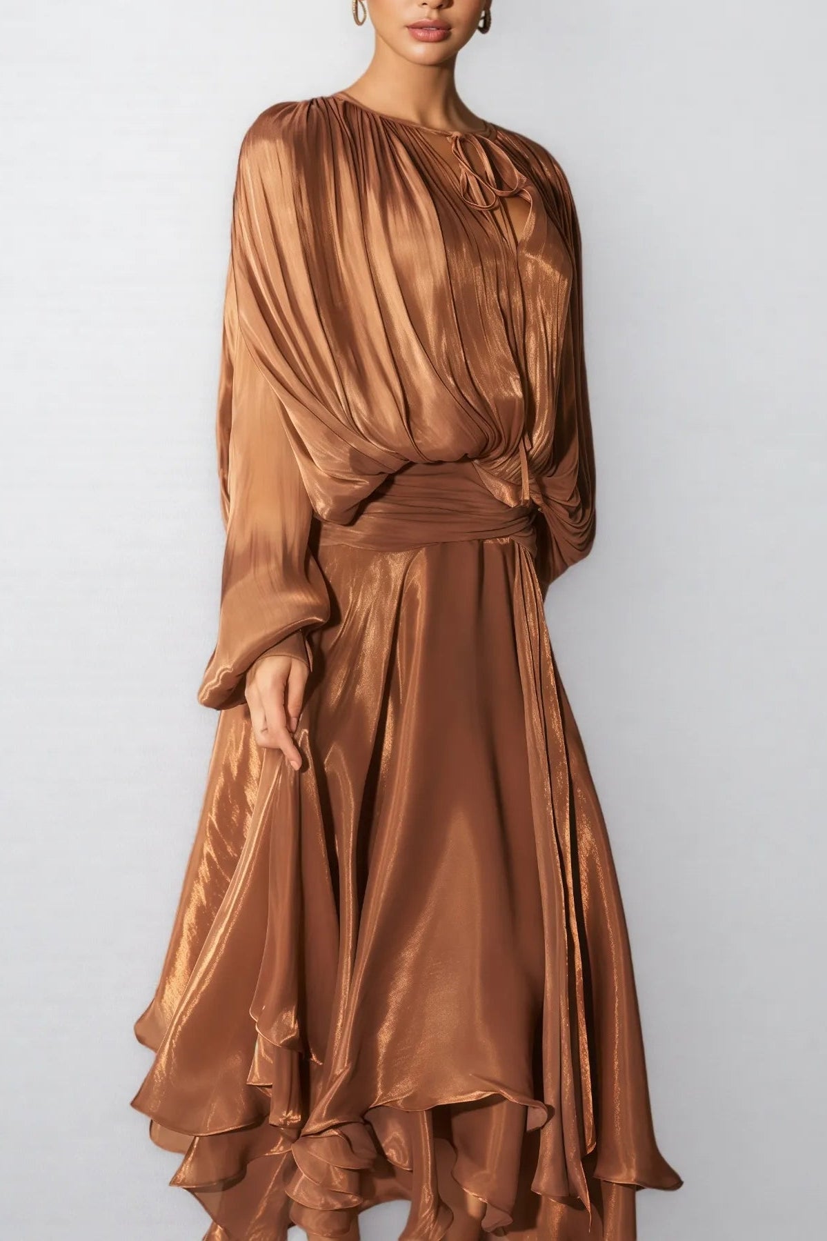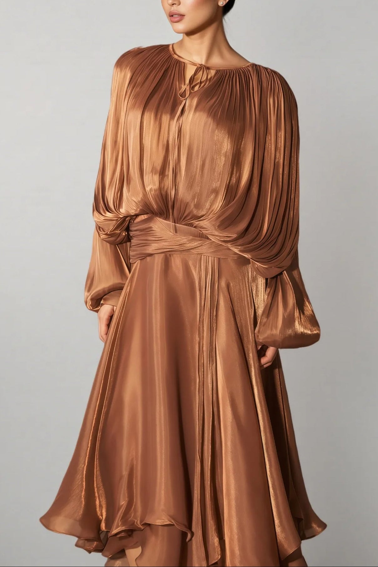 brown Pleated Bodice Draped puff sleeve Maxi Dress