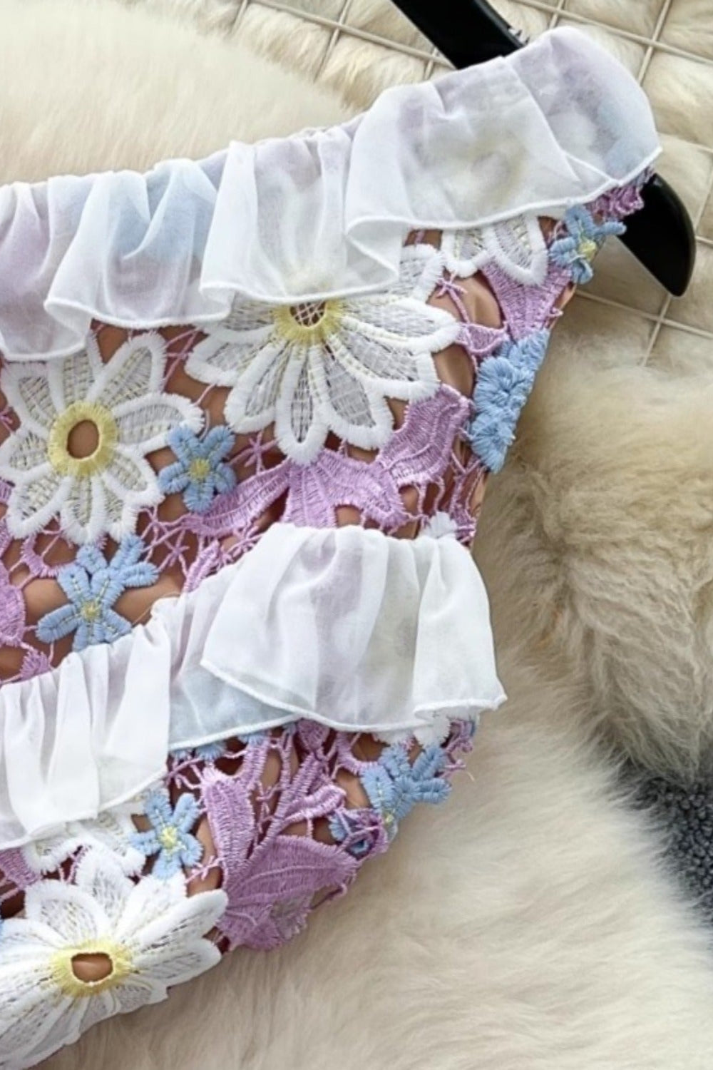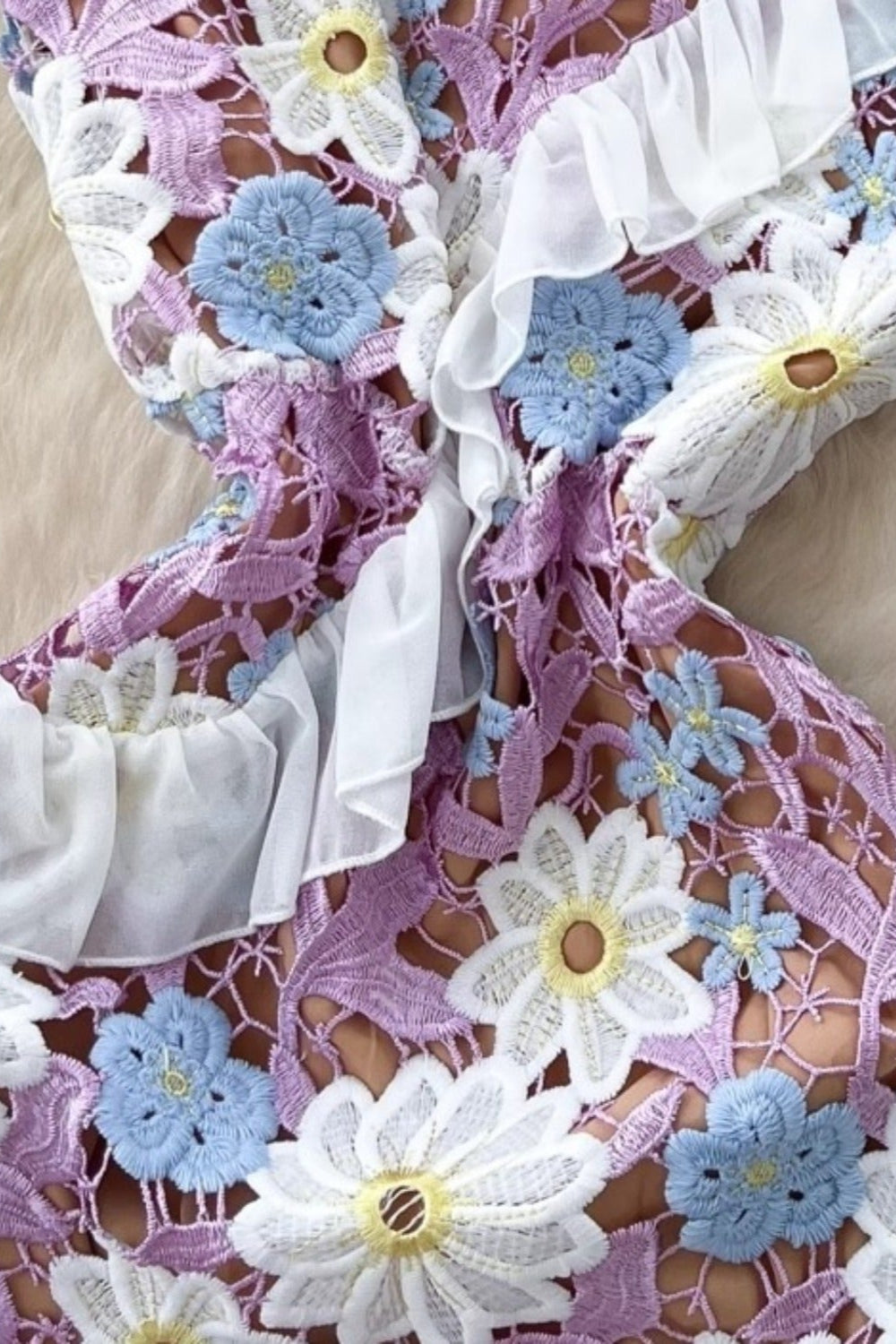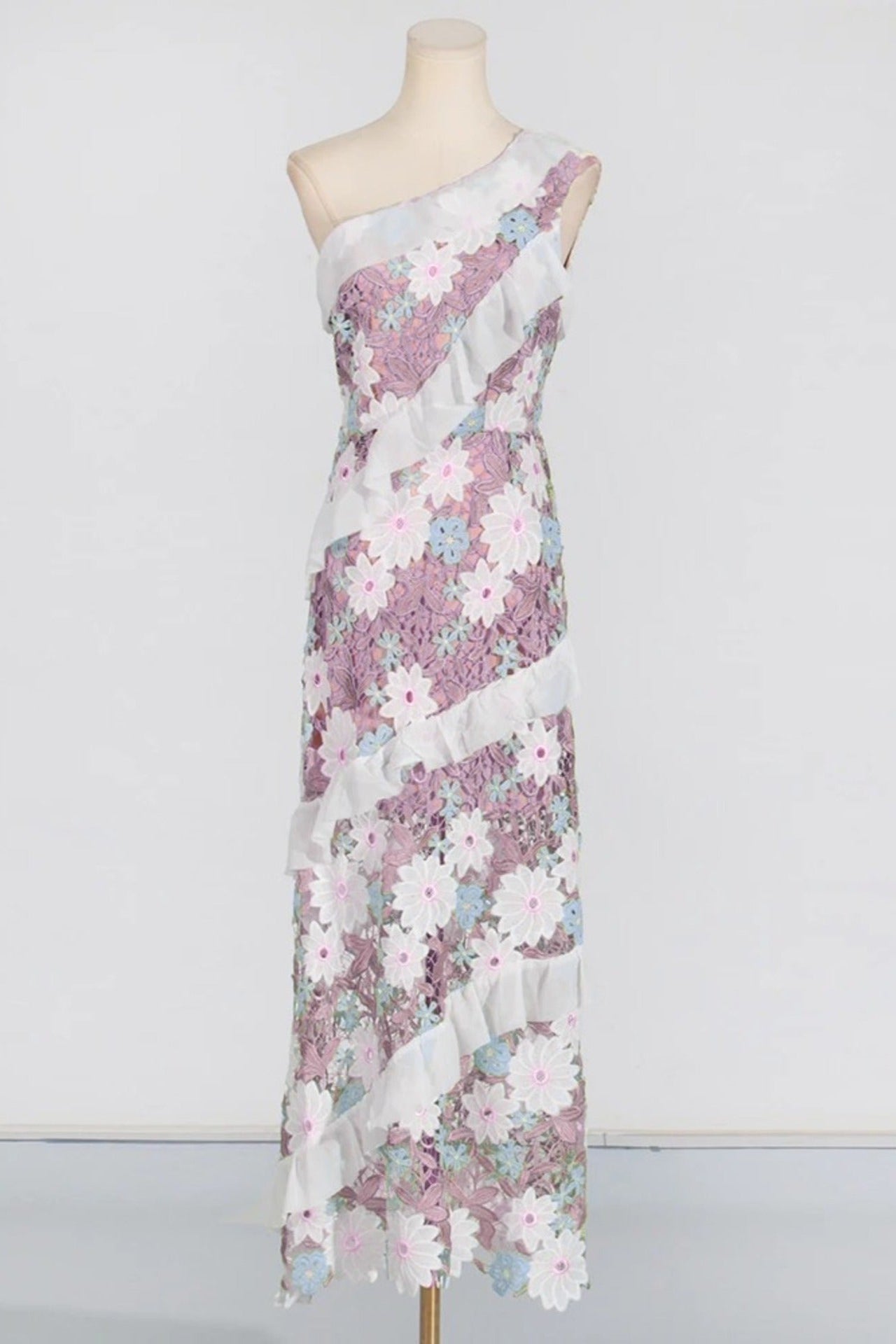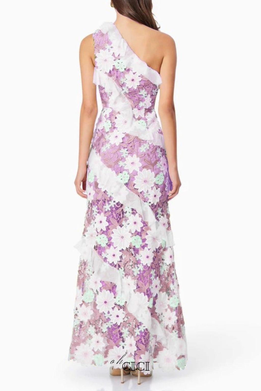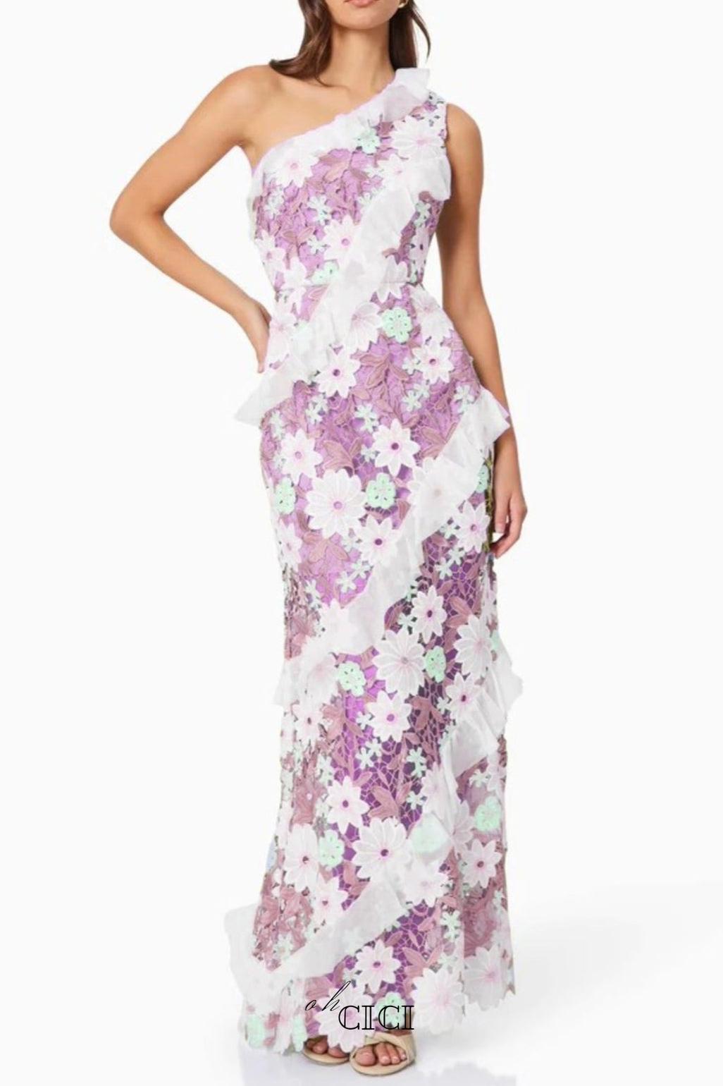Elevate your occasion wear with this Floral One Shoulder Lace Maxi Dress in purple. Expertly crafted with delicate lace, it offers a graceful silhouette amplified by the asymmetric one-shoulder design. The flowing maxi length enhances movement and adds sophistication, making it ideal for formal events or elegant evenings. The rich purple hue complements a variety of skin tones, ensuring a striking and memorable presence.