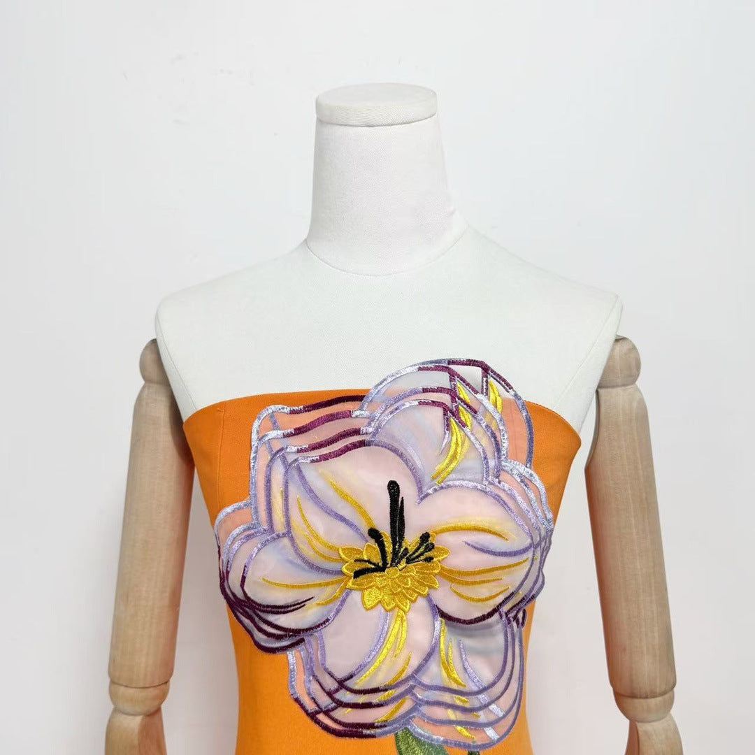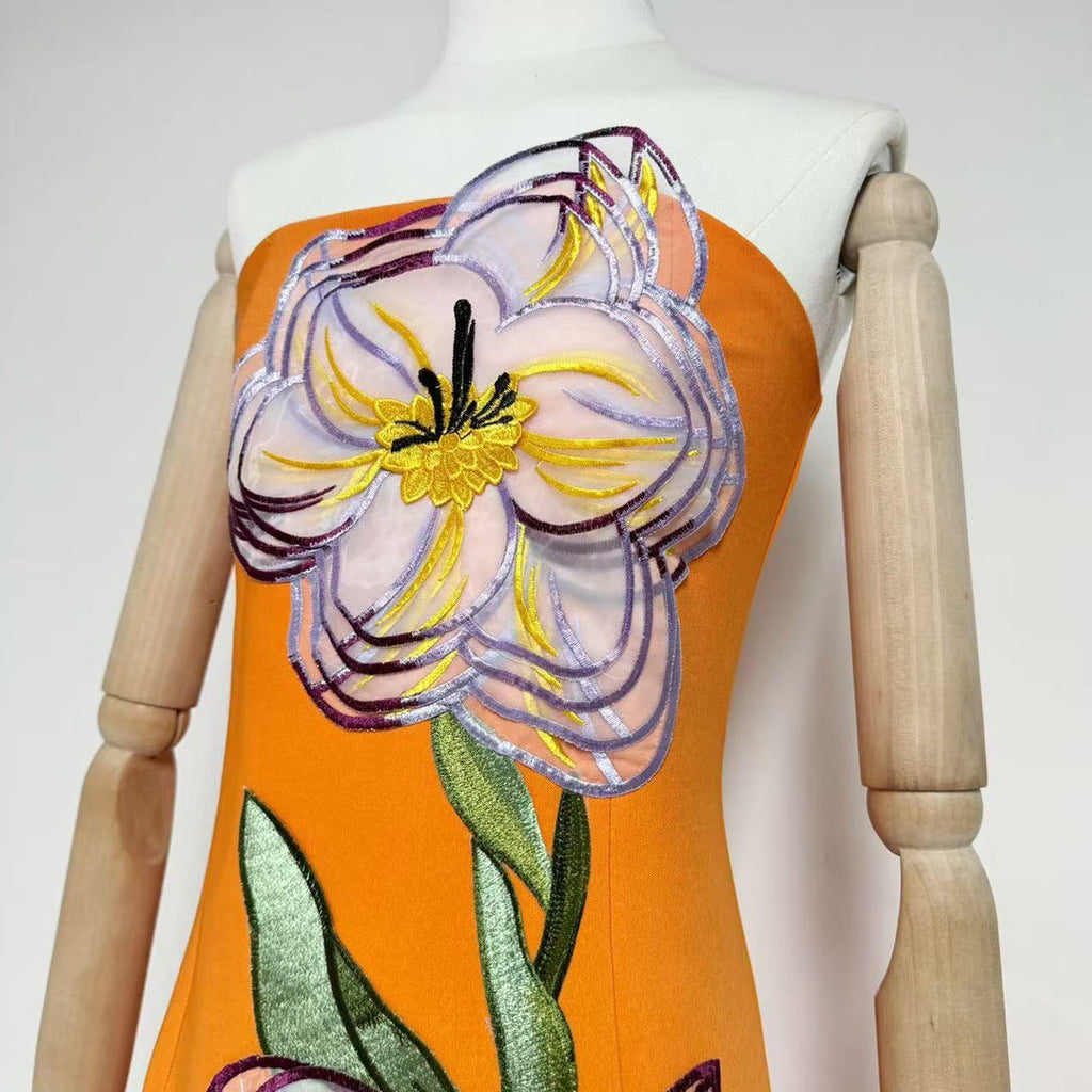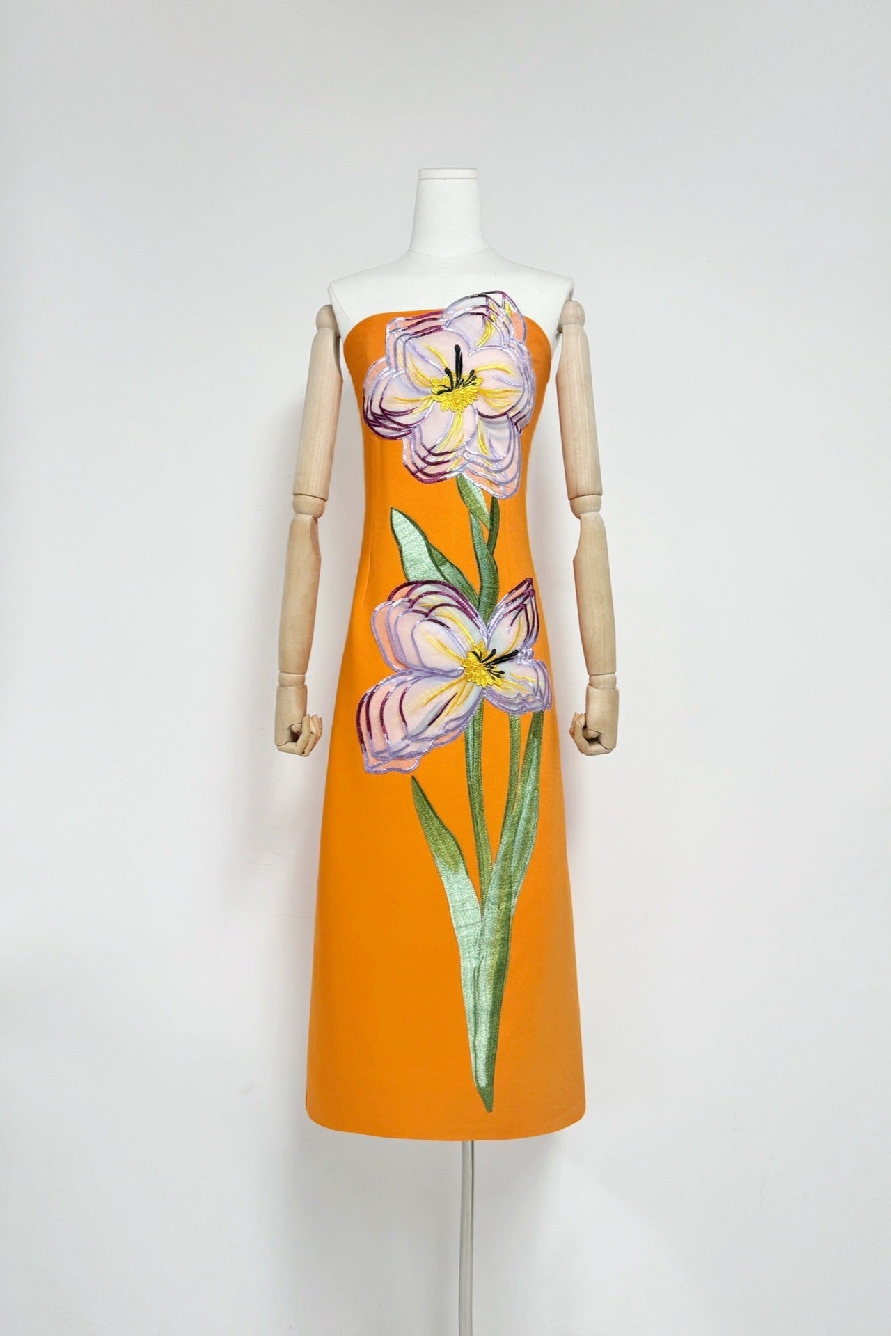 Energetically jump into summer, as irises in organza are embroidered onto a bright canary yellow base.