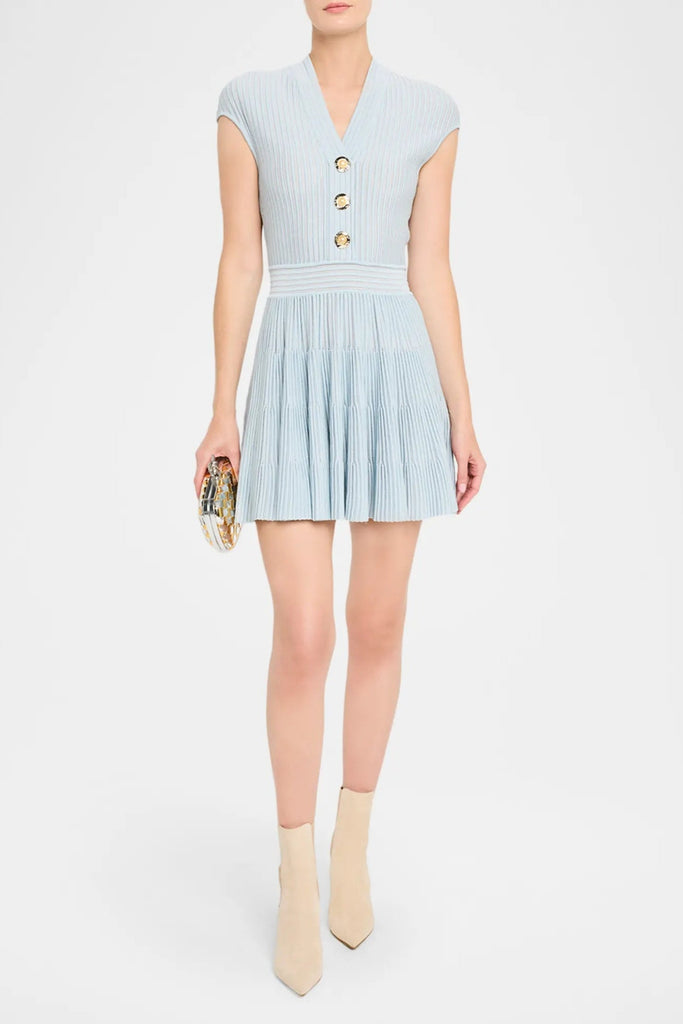Short-Sleeve Flechage Knit Flare Mini Dress in blue