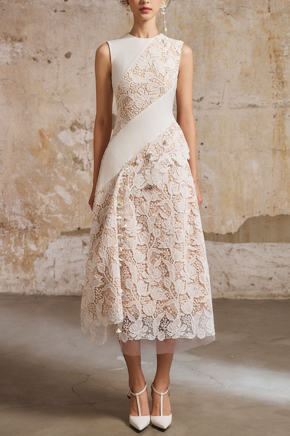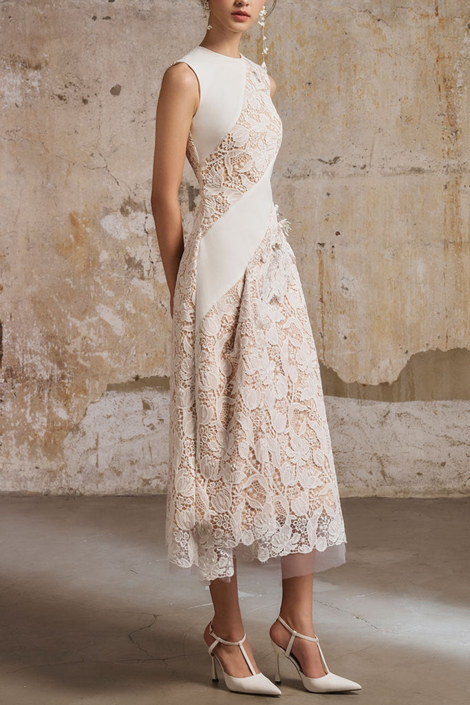 A-line Jewel Neck Lace Midi Dress In White