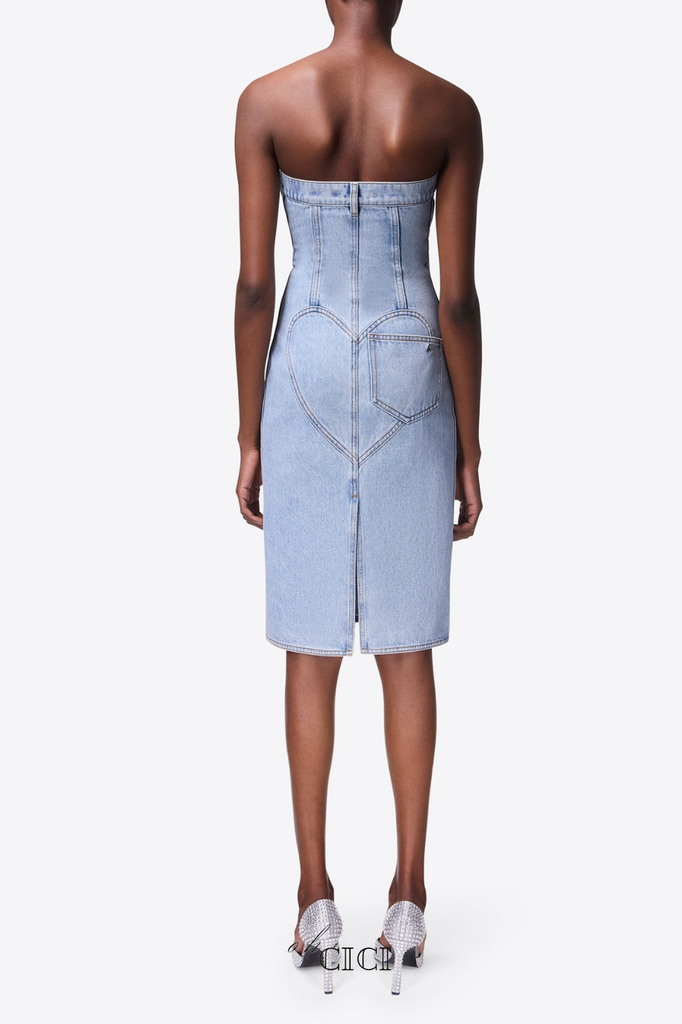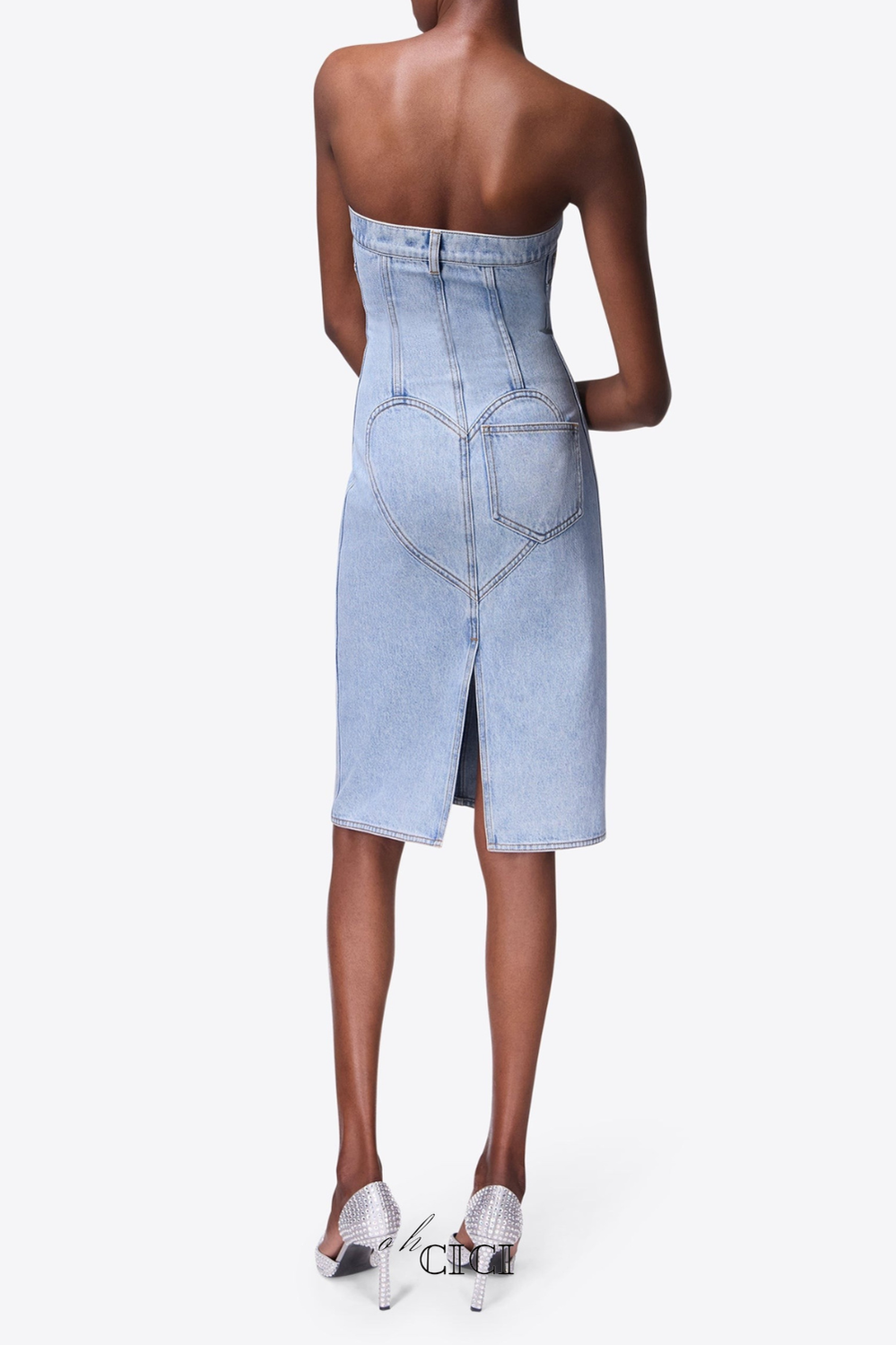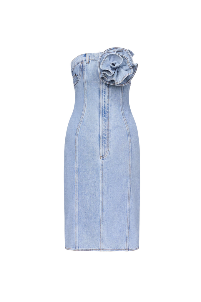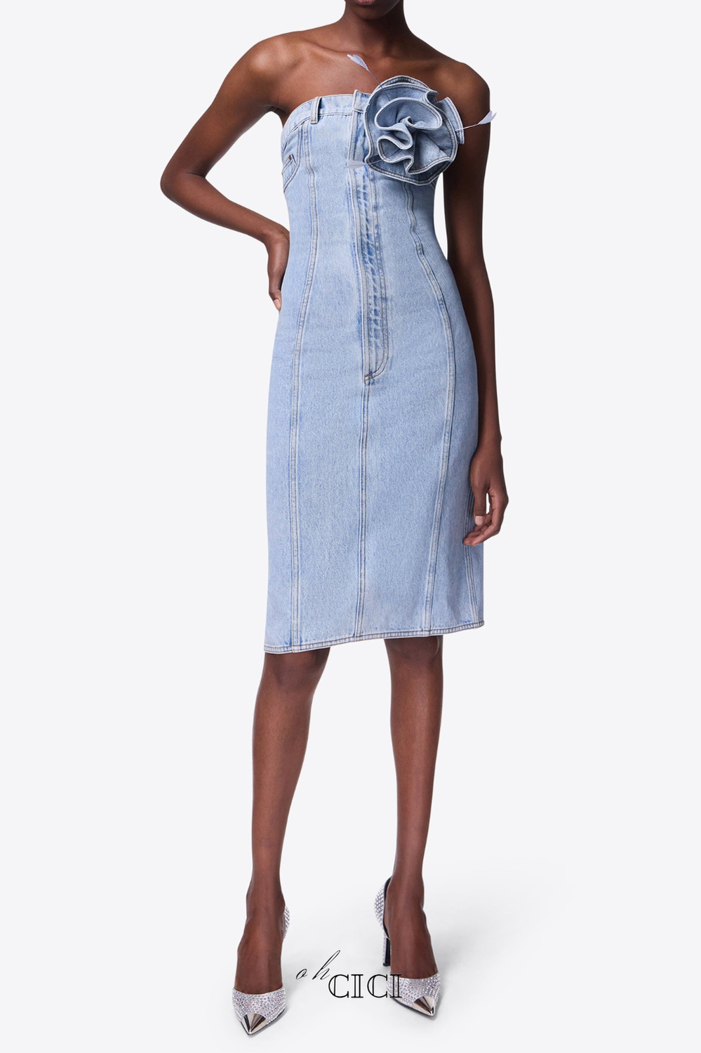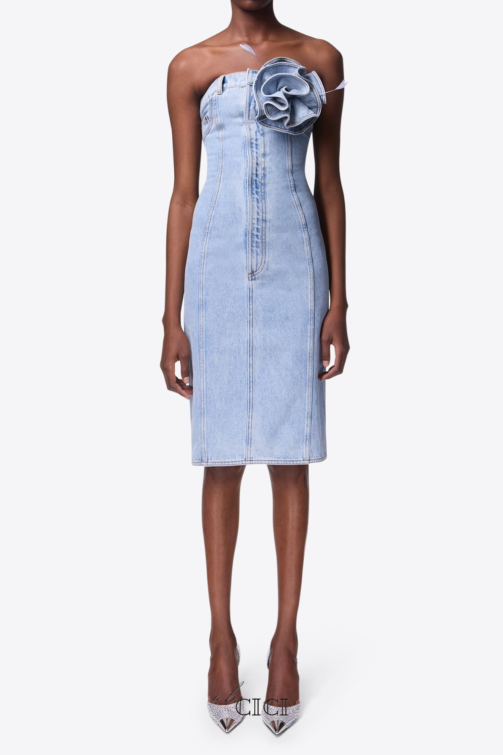 This strapless midi dress in light wash blue features an elegant flower corsage detail that adds sophisticated dimension to its silhouette. Crafted with precision tailoring, the structured bodice provides comfortable support while the midi length offers versatile styling options for various occasions. The soft blue hue creates a refined aesthetic that transitions seamlessly from daytime events to evening gatherings.