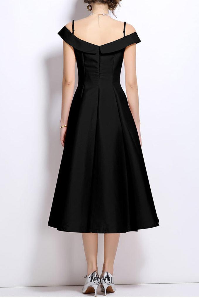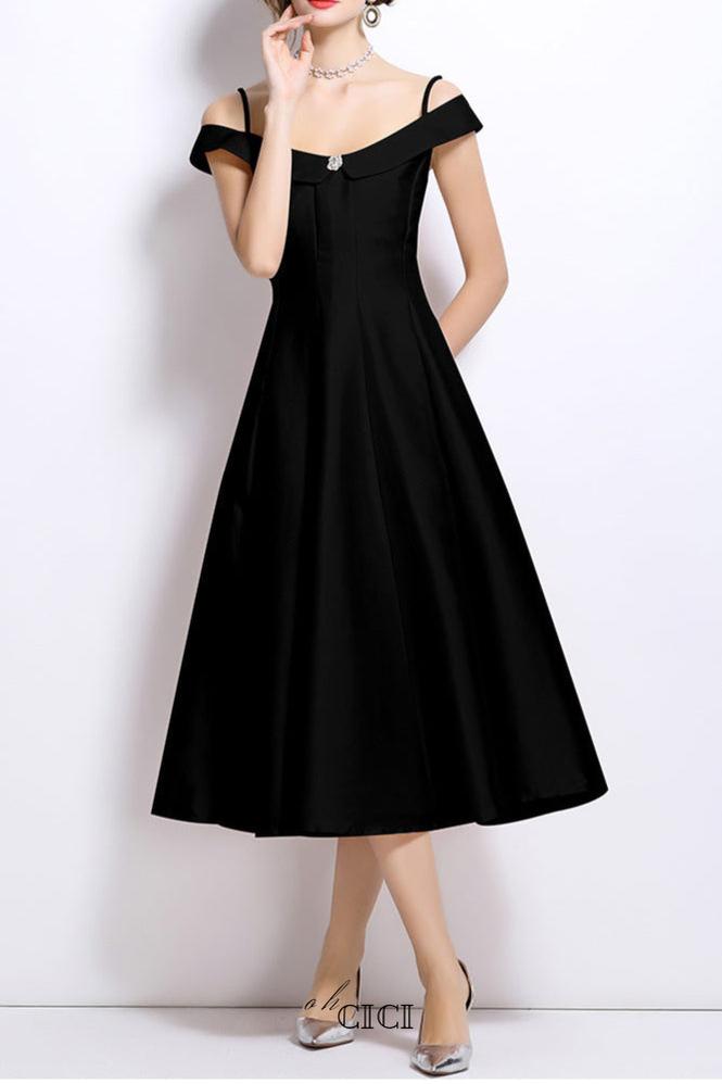 Elevate your wardrobe with the Meroy off-shoulder satin pleated midi dress in black. Crafted from smooth satin fabric, this dress features elegant pleats that create graceful movement and refined texture. The off-shoulder design highlights the neckline, offering a sophisticated yet alluring silhouette. Perfect for formal events or evening occasions, its midi length balances classic style with modern elegance, ensuring you make a memorable impression.