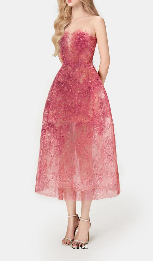 A midi dress with see-through elements and three intricate patterns is a stunning and unique addition to any wardrobe. The fabric creates a subtle and alluring look, while the raised patterns add depth and texture to the overall design. The midi length provides a modest and sophisticated touch, allowing the dress to accentuate your figure elegantly. Perfect for a variety of occasions, from a night out on the town to a special event, this dress ensures you stand out with its blend of sophistication and style.