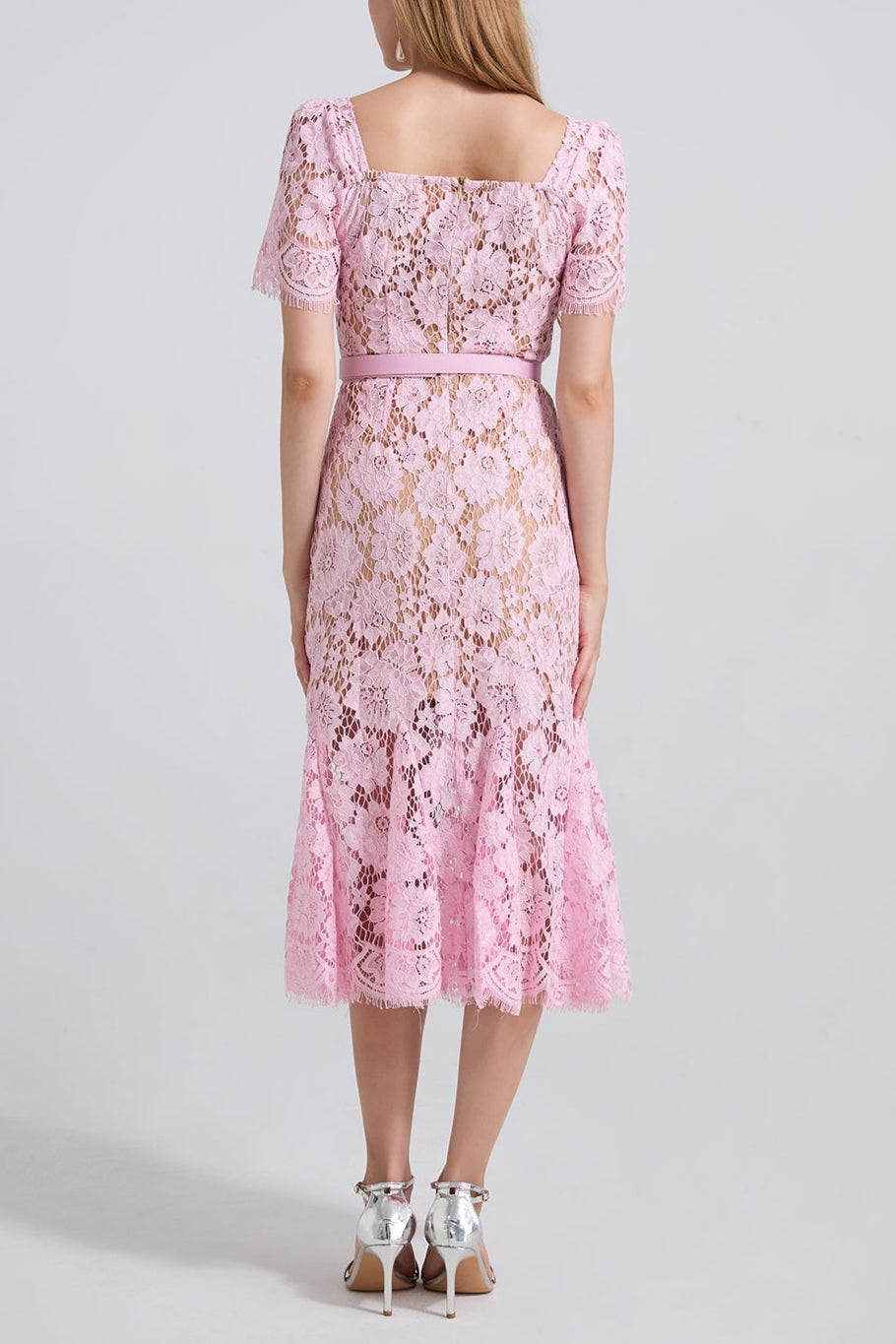 This elegant pink midi dress features a flattering square neckline and delicate lace detailing, creating a timeless and feminine look. Short sleeves offer comfortable coverage, while the included belt cinches the waist to enhance your silhouette. Perfect for special occasions or stylish everyday wear, this dress combines classic charm with modern comfort.