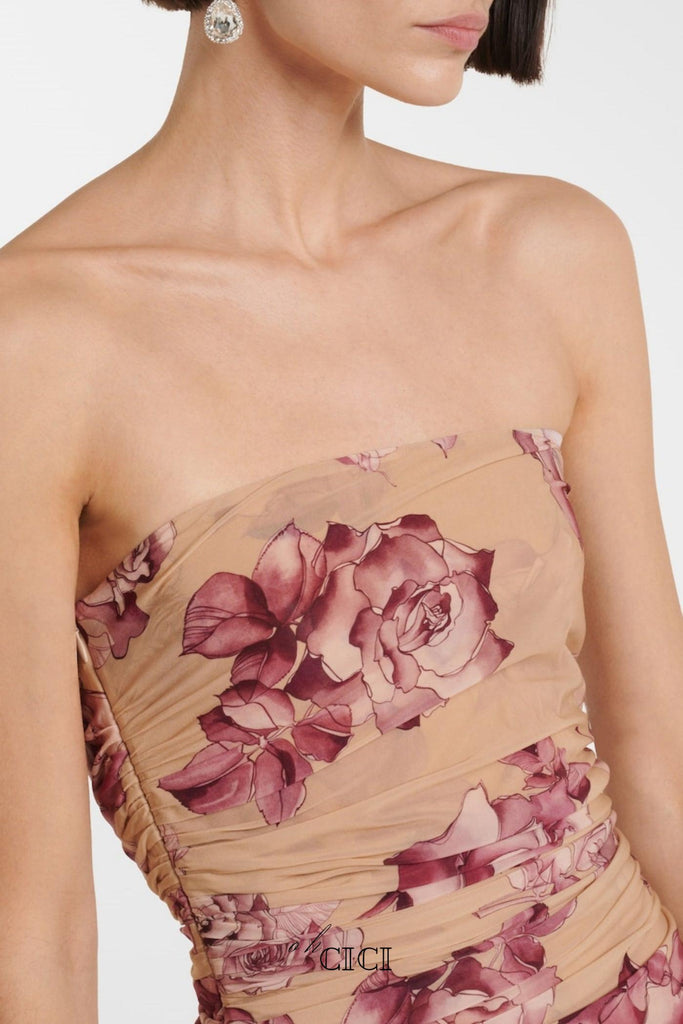 Elevate your wardrobe with the Taysia Floral Strapless Ruched Midi Dress. This refined silhouette features artful ruching that gracefully contours your figure, while the strapless design offers elegant shoulder exposure. The sophisticated floral pattern transitions effortlessly from daytime engagements to evening soirées, embodying timeless femininity with contemporary appeal.