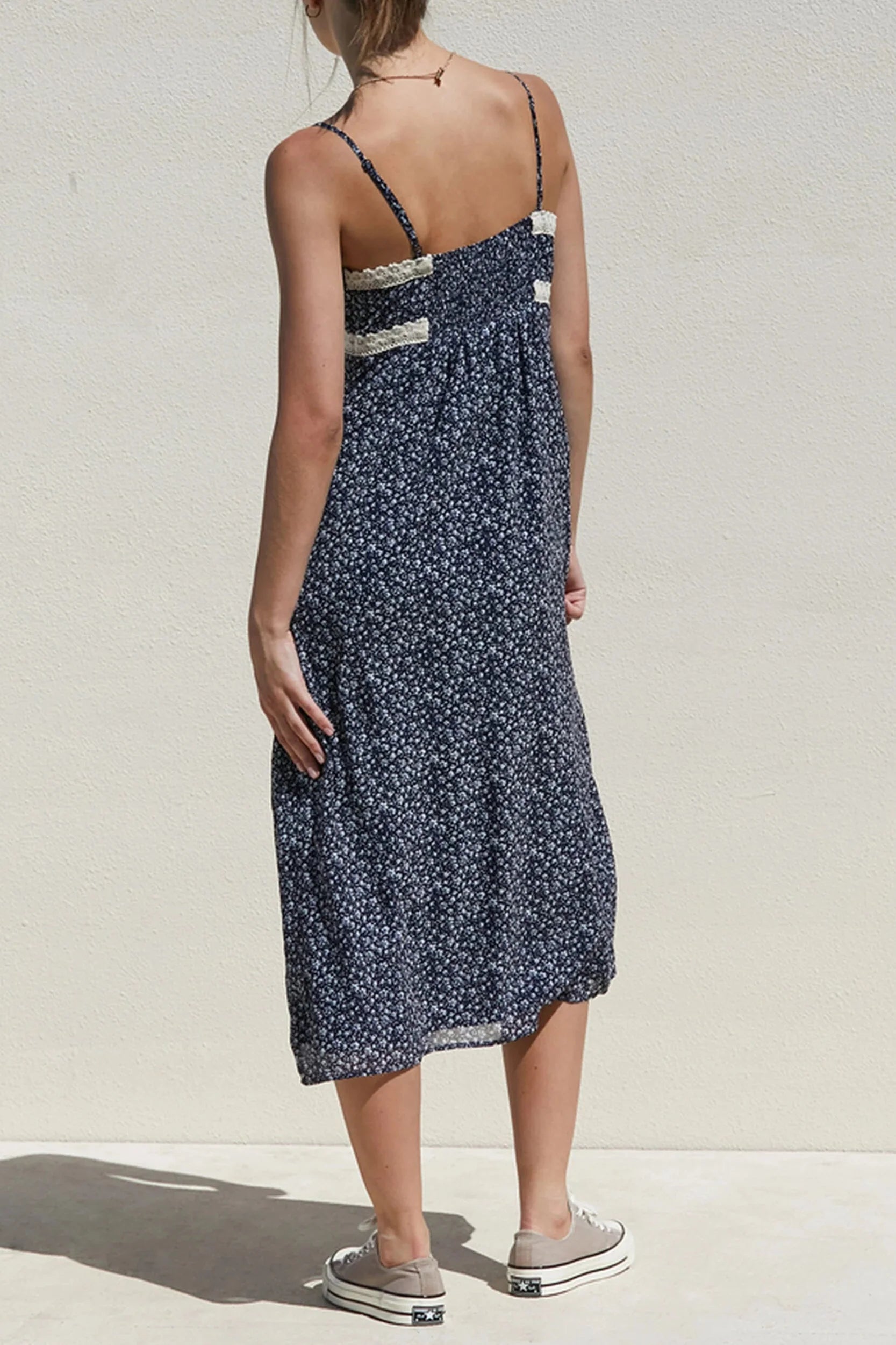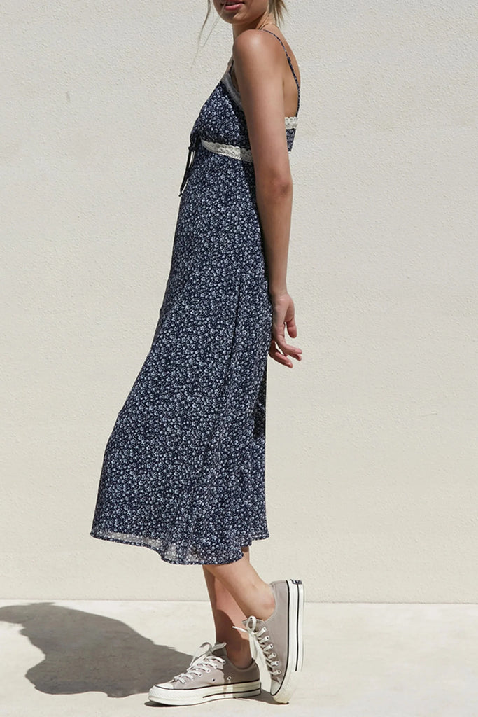 Elevate your wardrobe with this navy midi dress featuring a sophisticated v-neckline and delicate floral lace trim. Designed for a flattering silhouette, its refined details offer a perfect balance of elegance and modern style, ideal for both formal occasions and upscale casual events. The rich navy hue enhances versatility, making it a timeless addition to your collection.