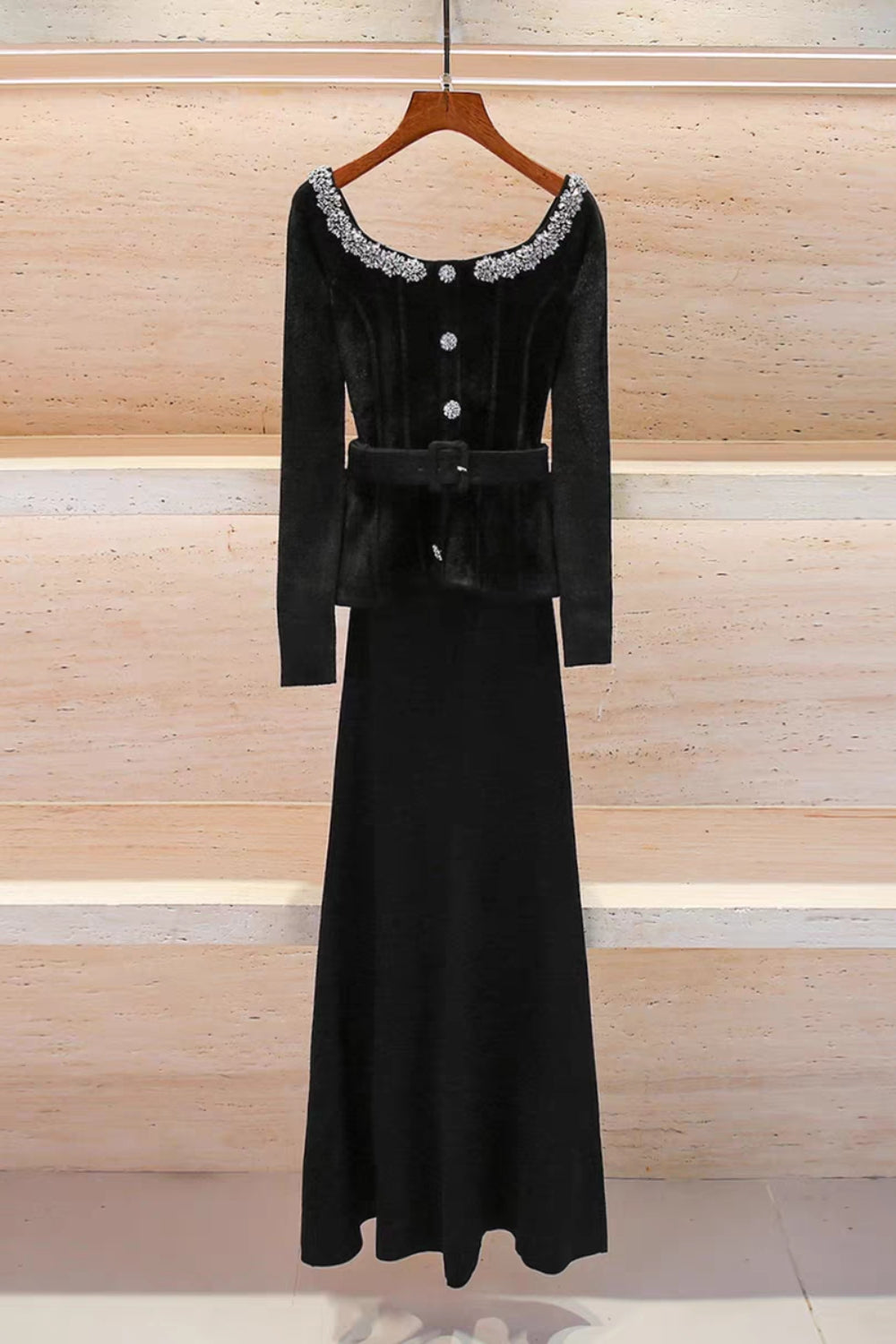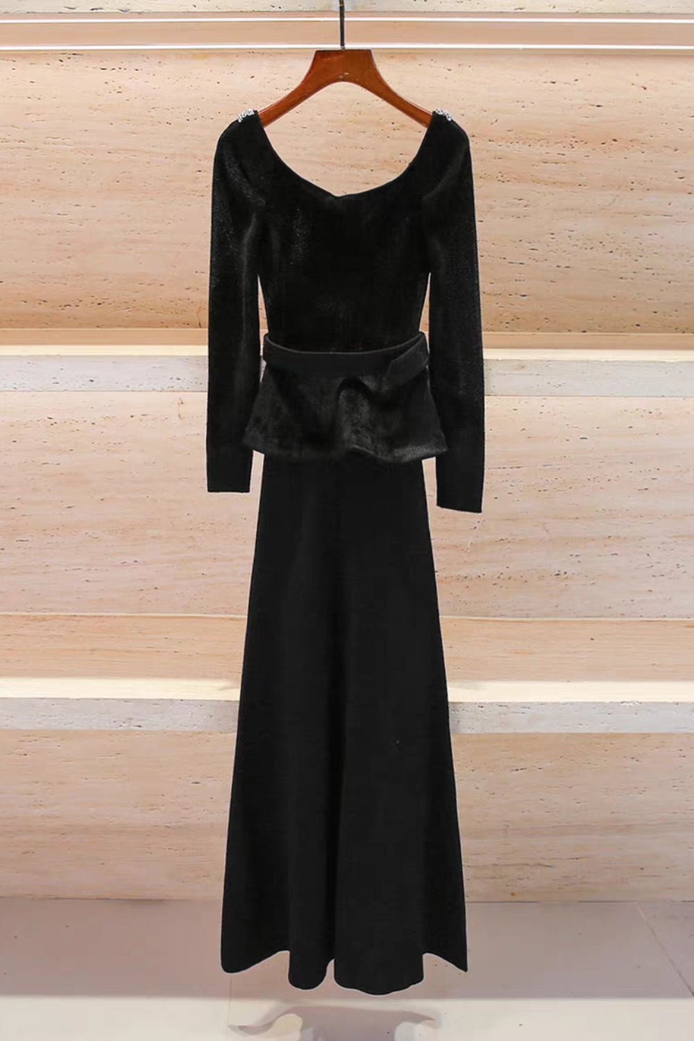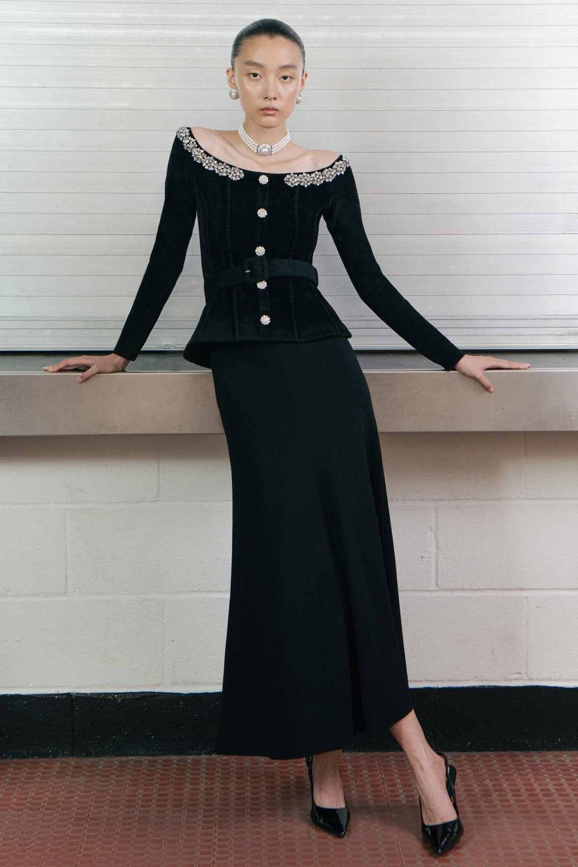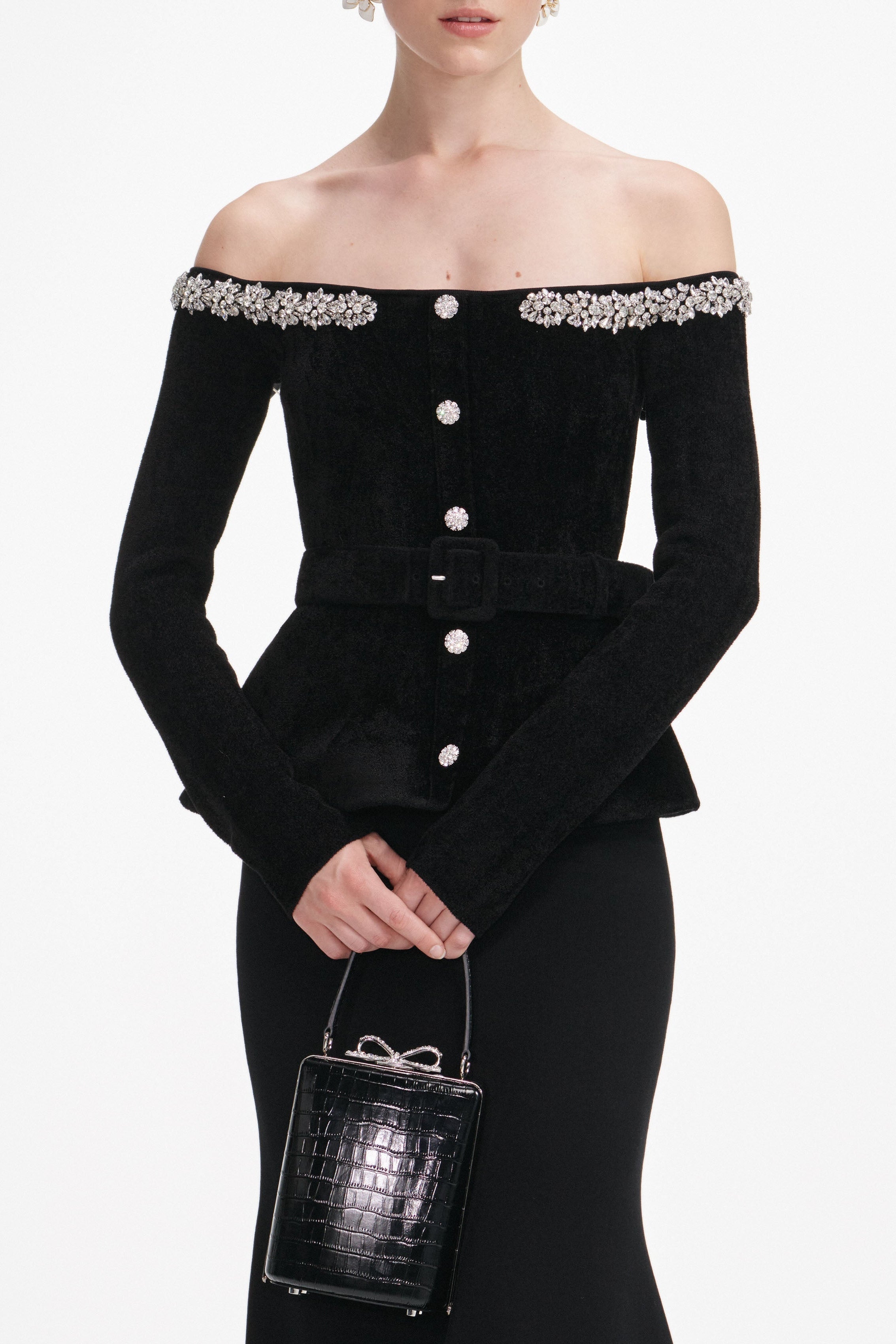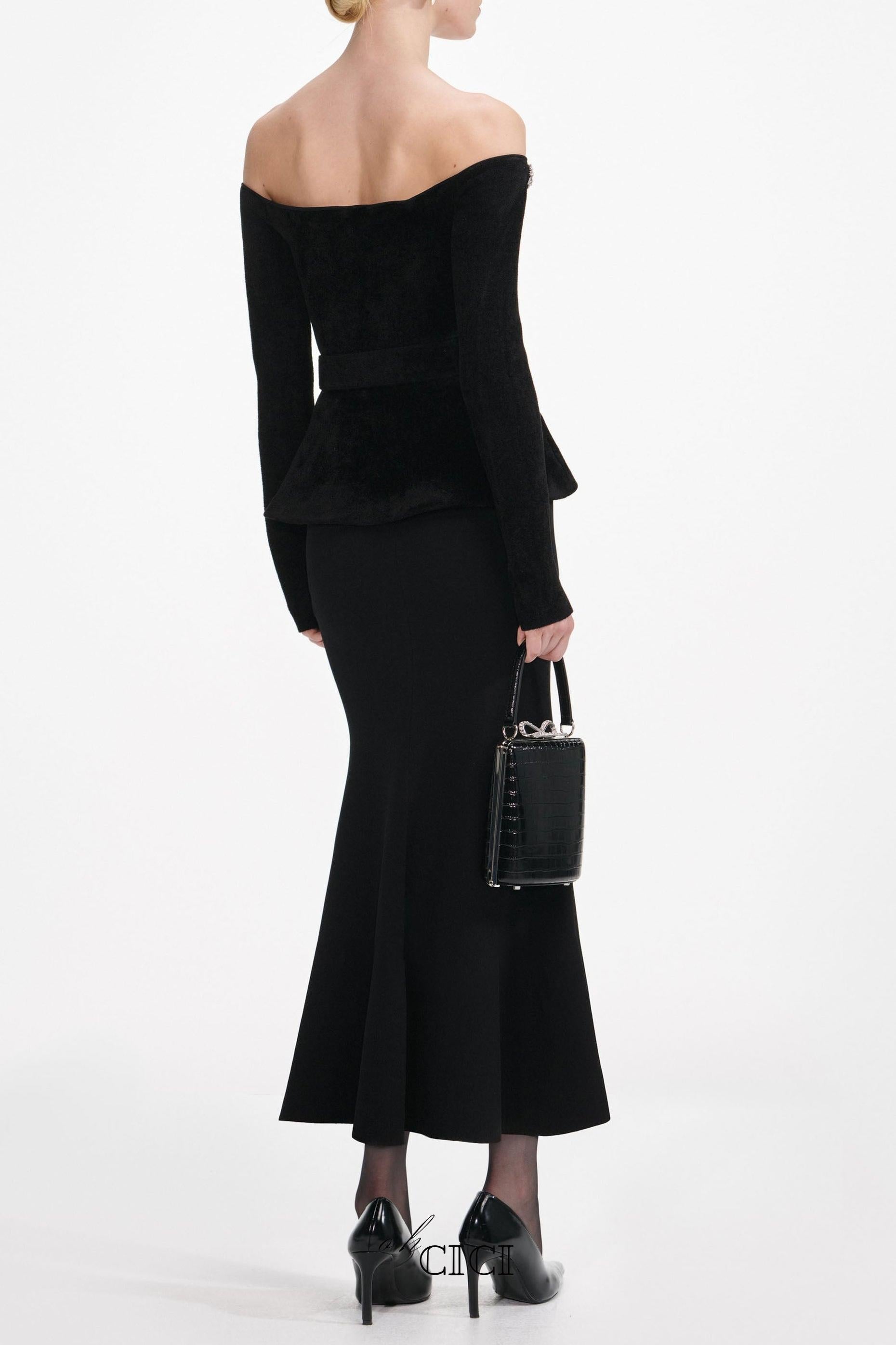 Rendered in chenille knit, this body-hugging LBD is as flattering as they come. Outlined with diamanté trim, the off-shoulder Bardot neckline adds sensual detail – get ready for a chic night out.