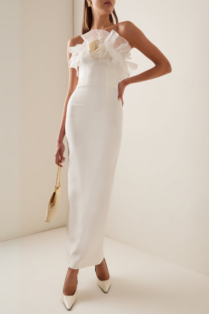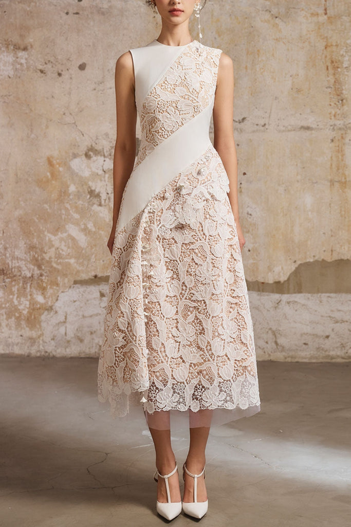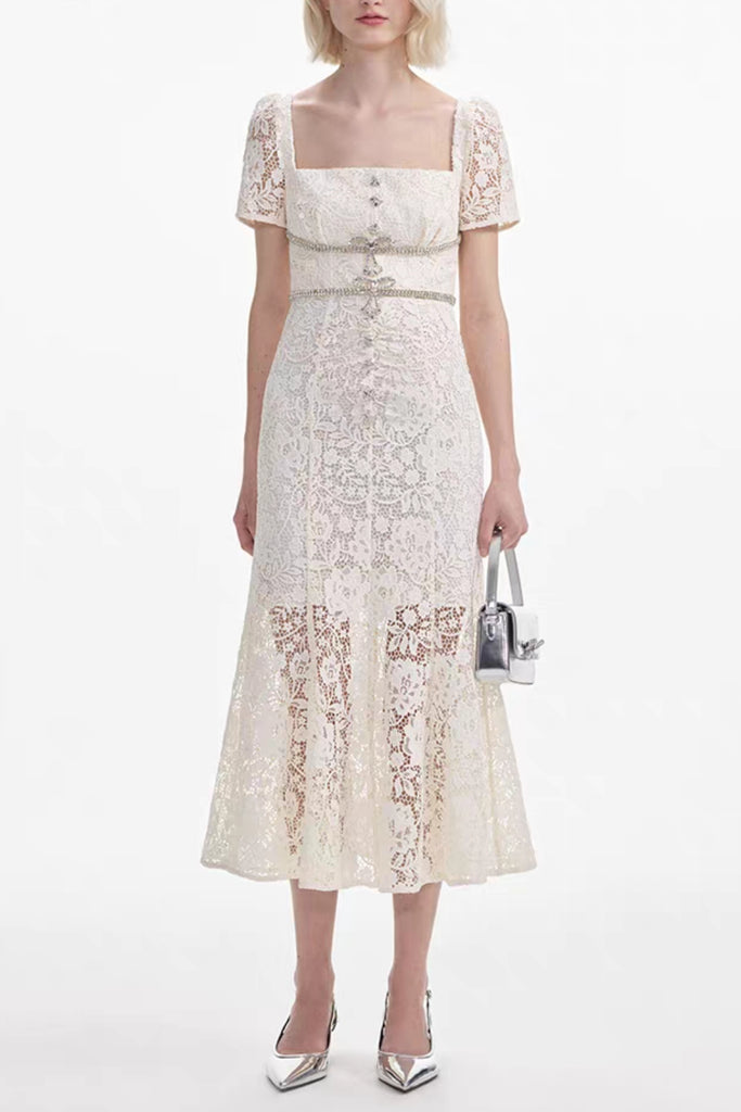 EMBROIDERED LACE MIDI DRESS IN CREAM