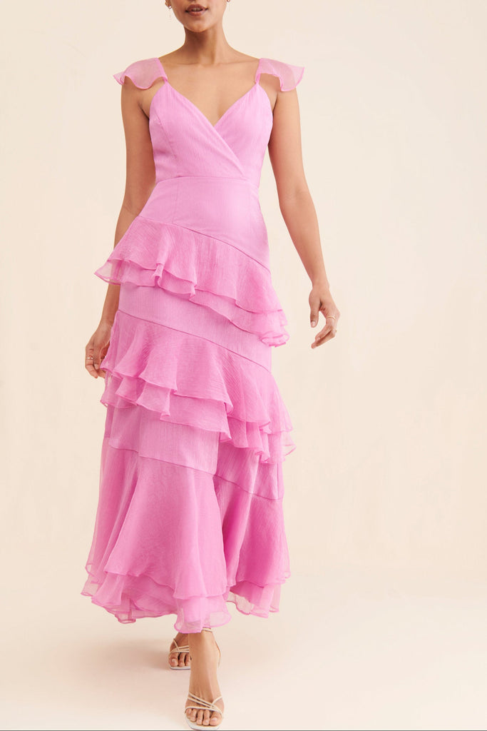 lucy Chiffon Ruffle layered Midi Dress in pink