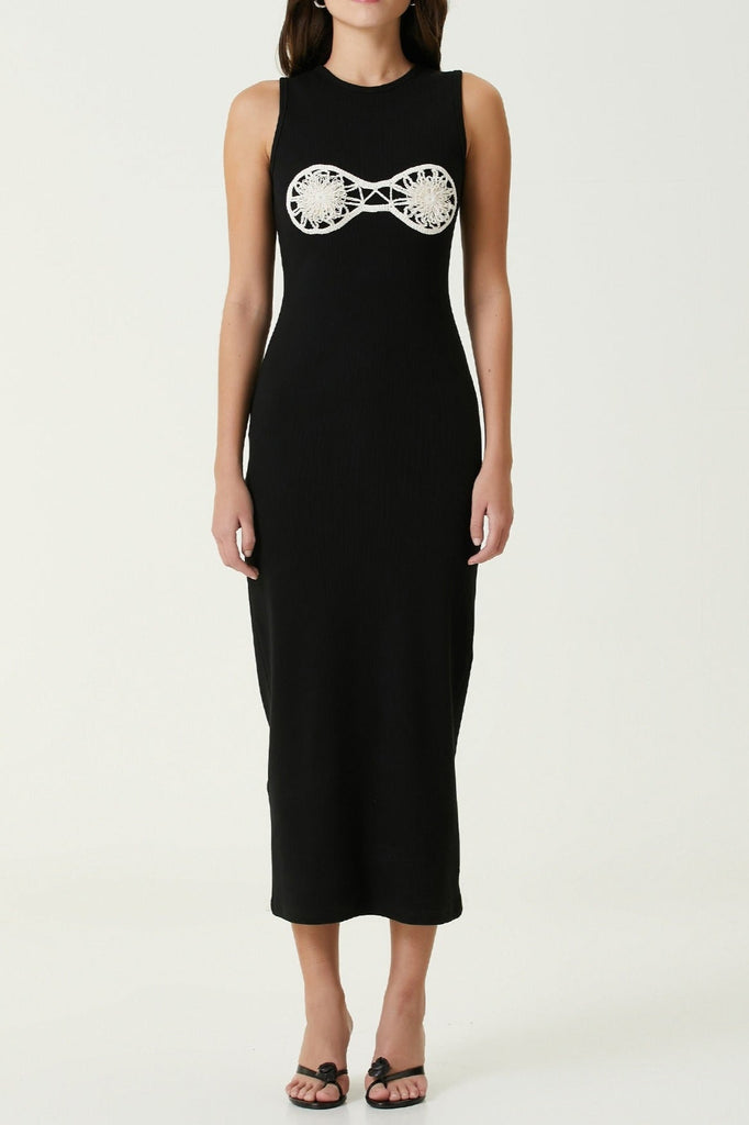 jenny Black Twist-Neck Feather Hem Midi Dress