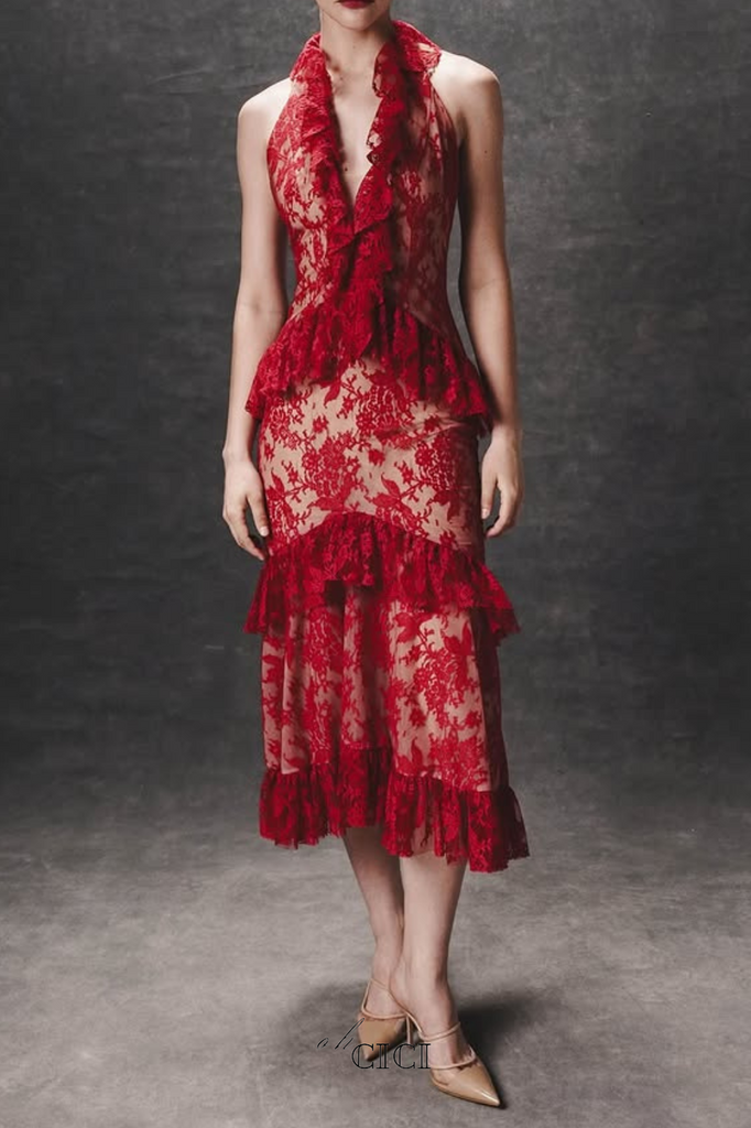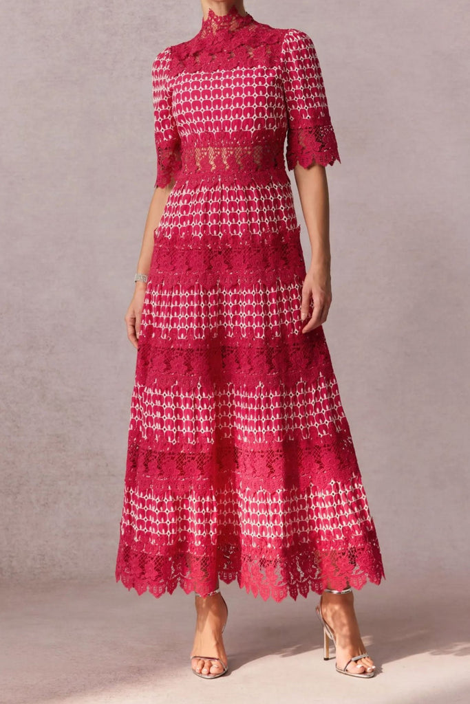 RED FLORAL LACE EMBROIDER MIDI DRESS