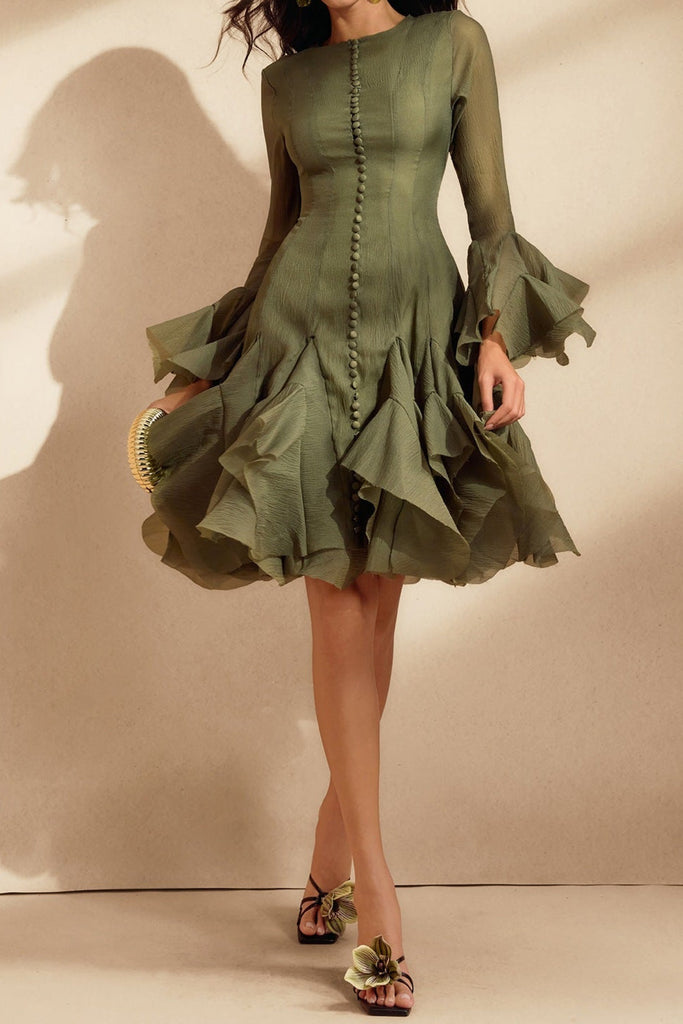 xanthe Flare Sleeve Button Mini Dress In Green