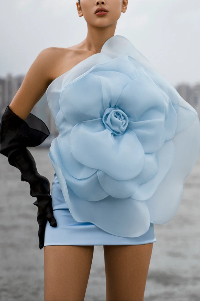 ONE SHOULDER FLOWER MINI DRESS IN BLUE