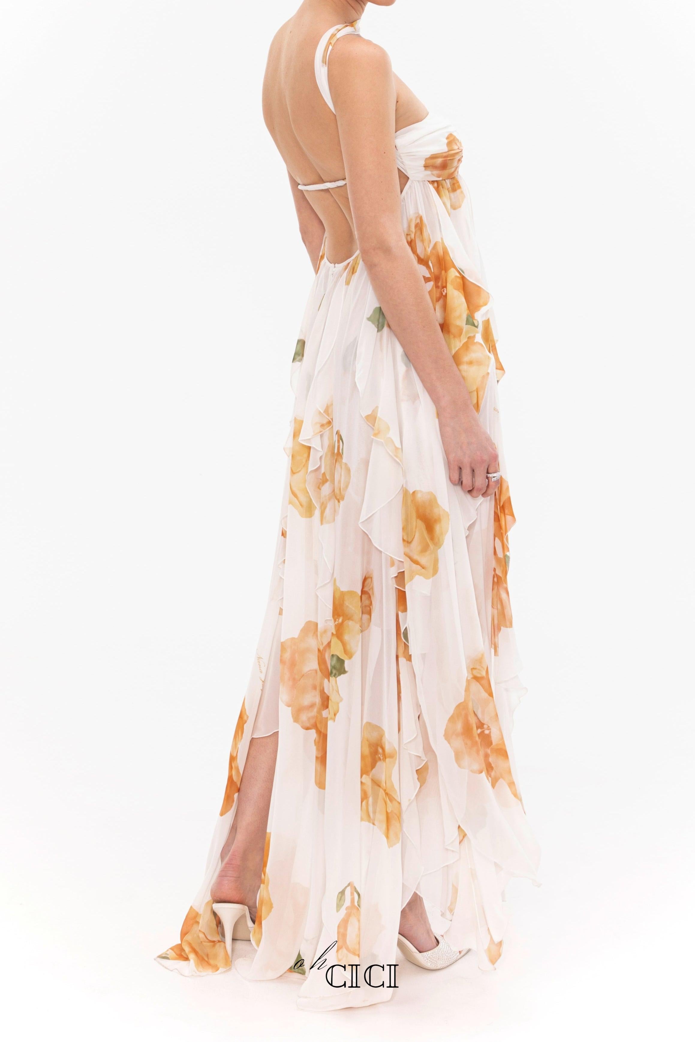 Step out in style with the joanna Floral Halter Backless Split Maxi Dress. Featuring a beautiful floral print, a halter neckline, and a stunning backless design, this dress exudes elegance and sophistication. The split detail adds a touch of femininity, making it a perfect choice for any special occasion.