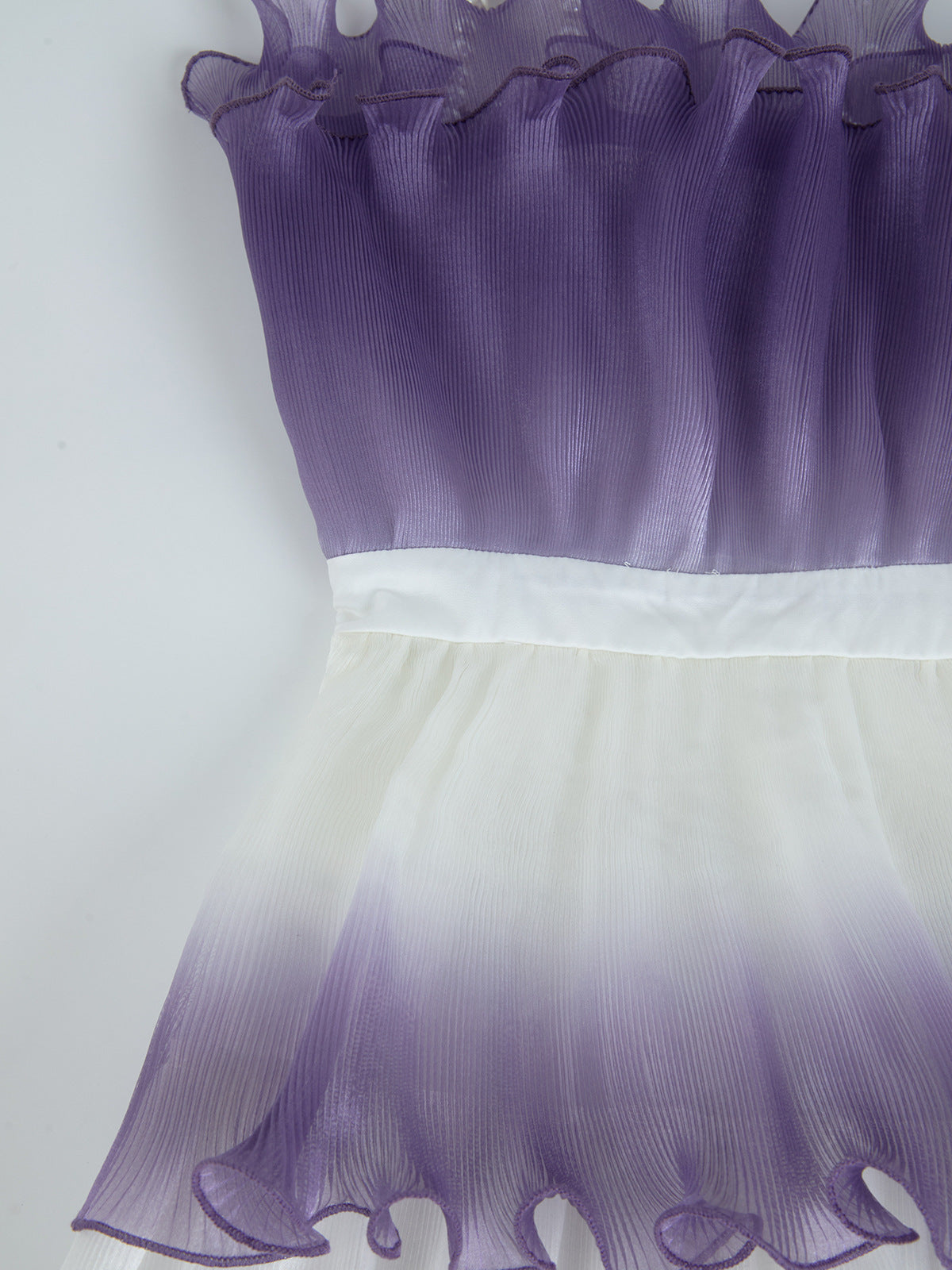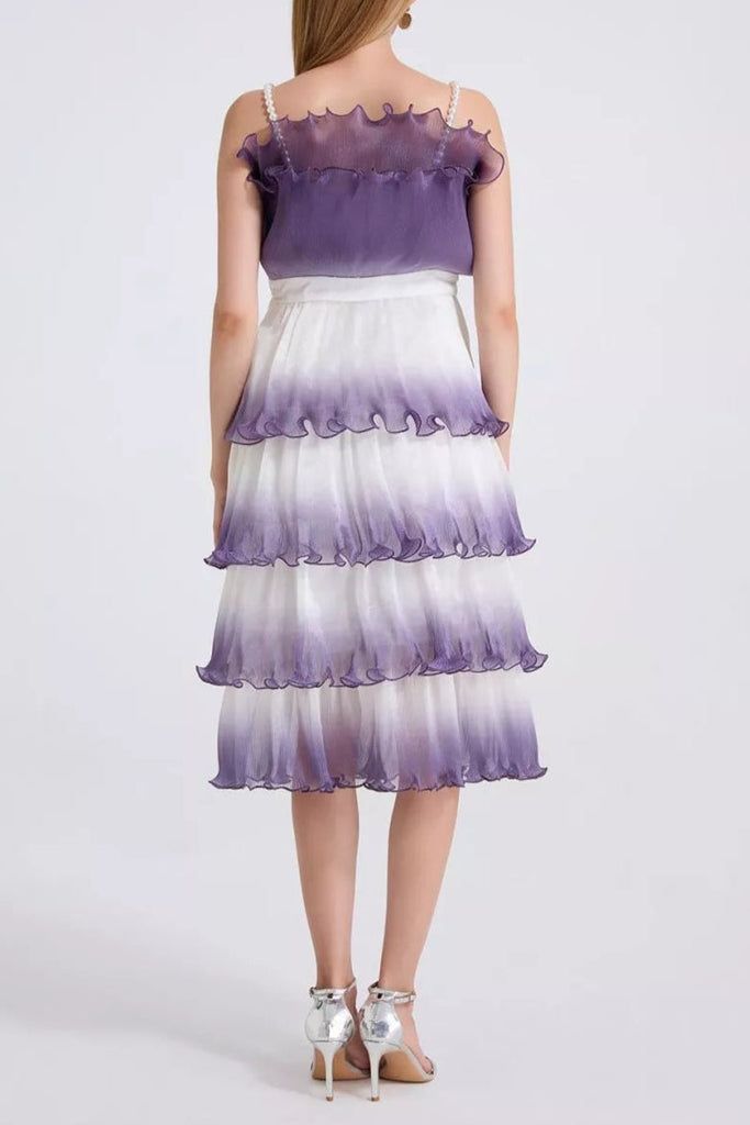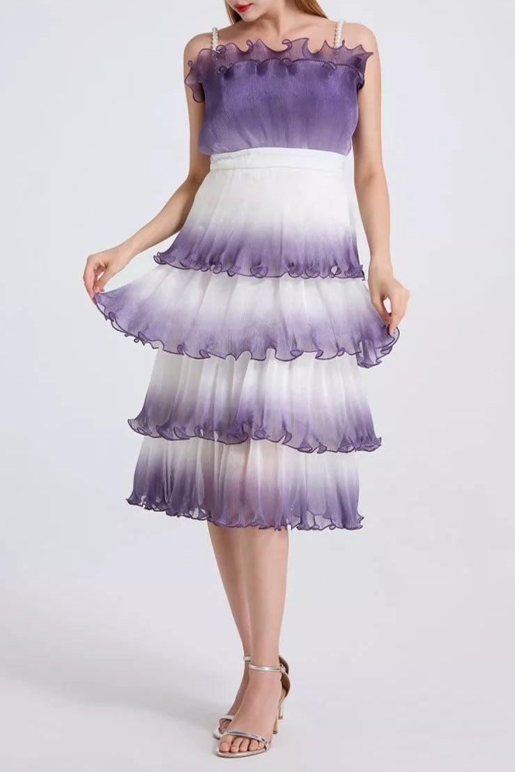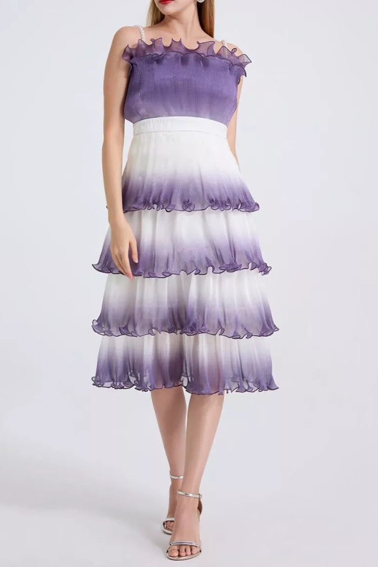 This purple gradient mini dress features delicate pleated layers and ruffle trim, creating a sophisticated silhouette with dynamic texture. Its lightweight fabric and tiered design offer graceful movement, making it an elegant choice for both daytime events and evening occasions. The gradient color adds depth and visual interest, enhancing the dress’s refined appeal.