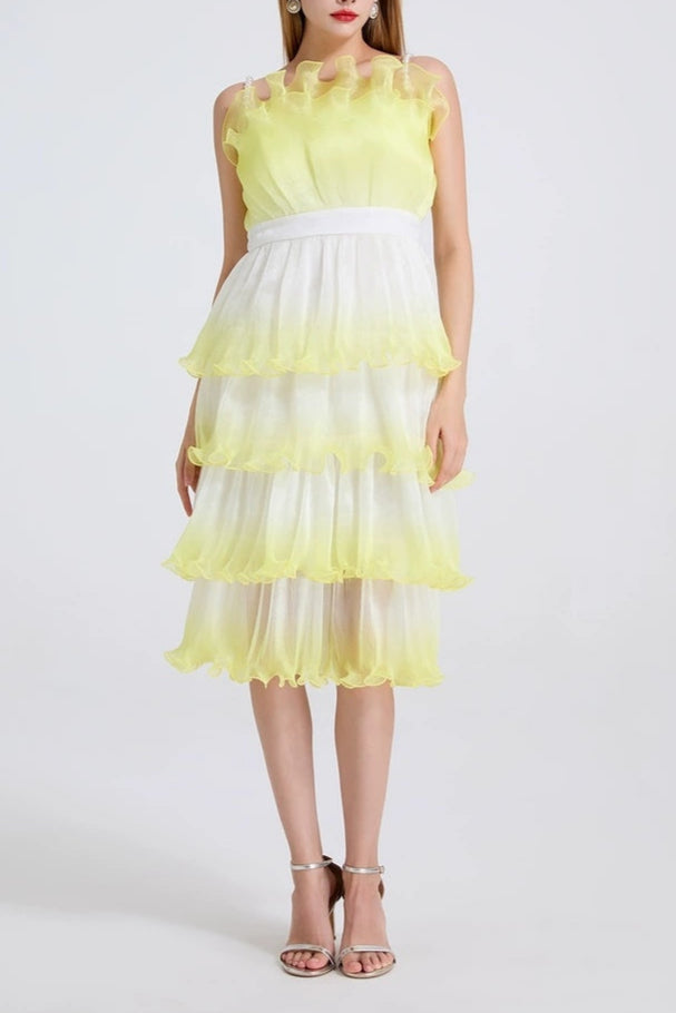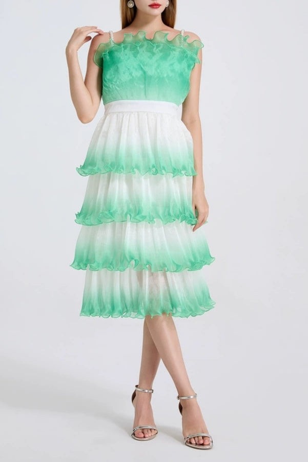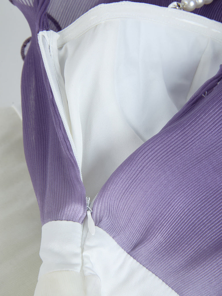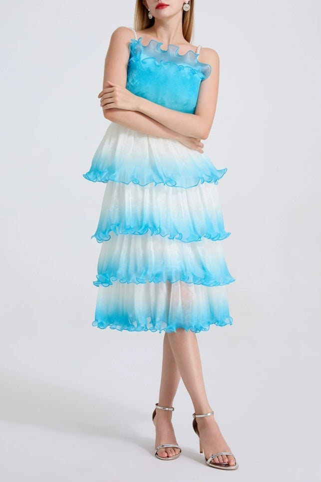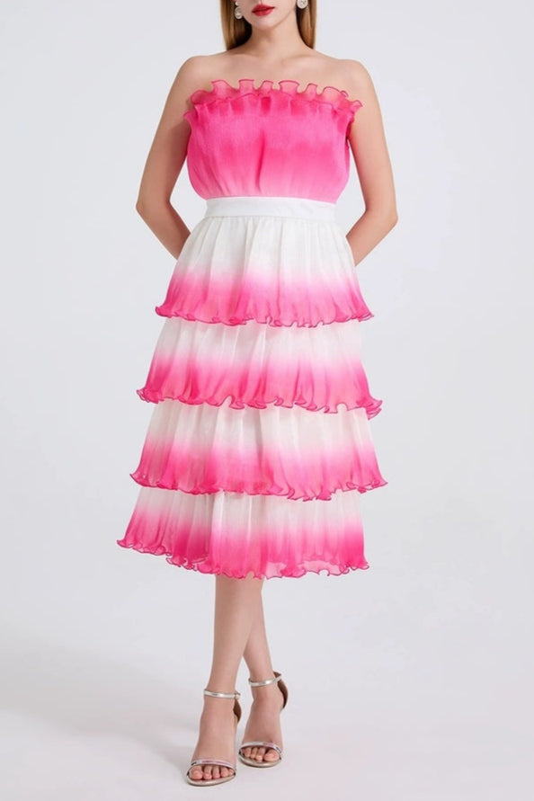 This purple gradient mini dress features delicate pleated layers and ruffle trim, creating a sophisticated silhouette with dynamic texture. Its lightweight fabric and tiered design offer graceful movement, making it an elegant choice for both daytime events and evening occasions. The gradient color adds depth and visual interest, enhancing the dress’s refined appeal.