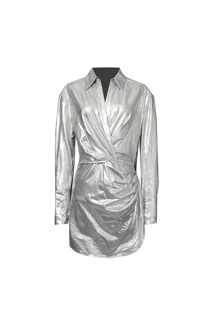 Elevate your evening repertoire with this striking metallic pleated shirt mini dress in silver. The lustrous fabric catches light beautifully, creating dynamic movement with each step, while the structured pleating adds sophisticated dimension and visual interest. Cut as a refined mini silhouette, it transitions seamlessly from cocktail events to upscale dinners. The shirt-inspired construction offers a polished, intentional aesthetic that distinguishes it from conventional party wear. Perfect for those who appreciate architectural tailoring and statement-making pieces that command attention without compromising elegance.