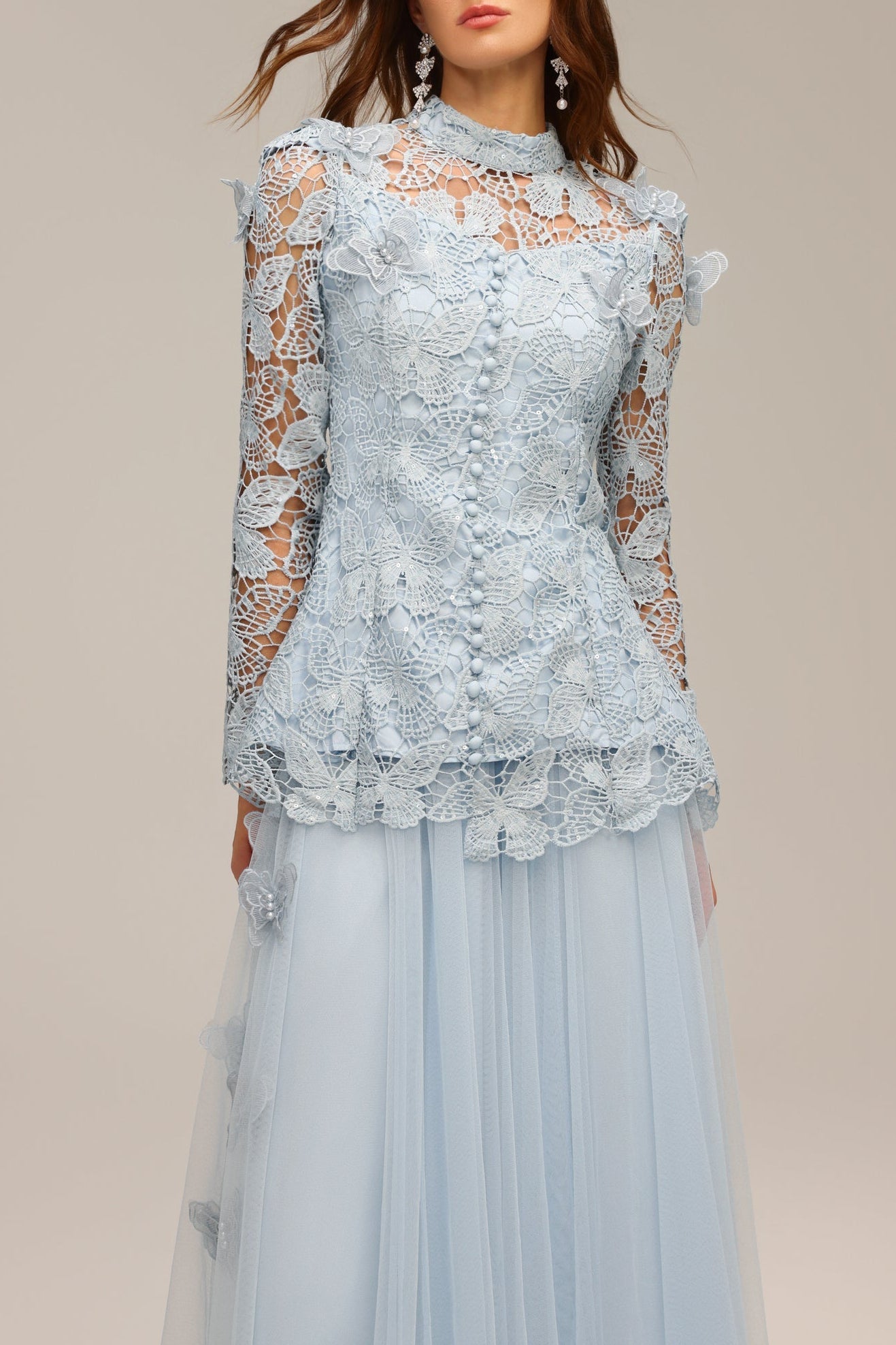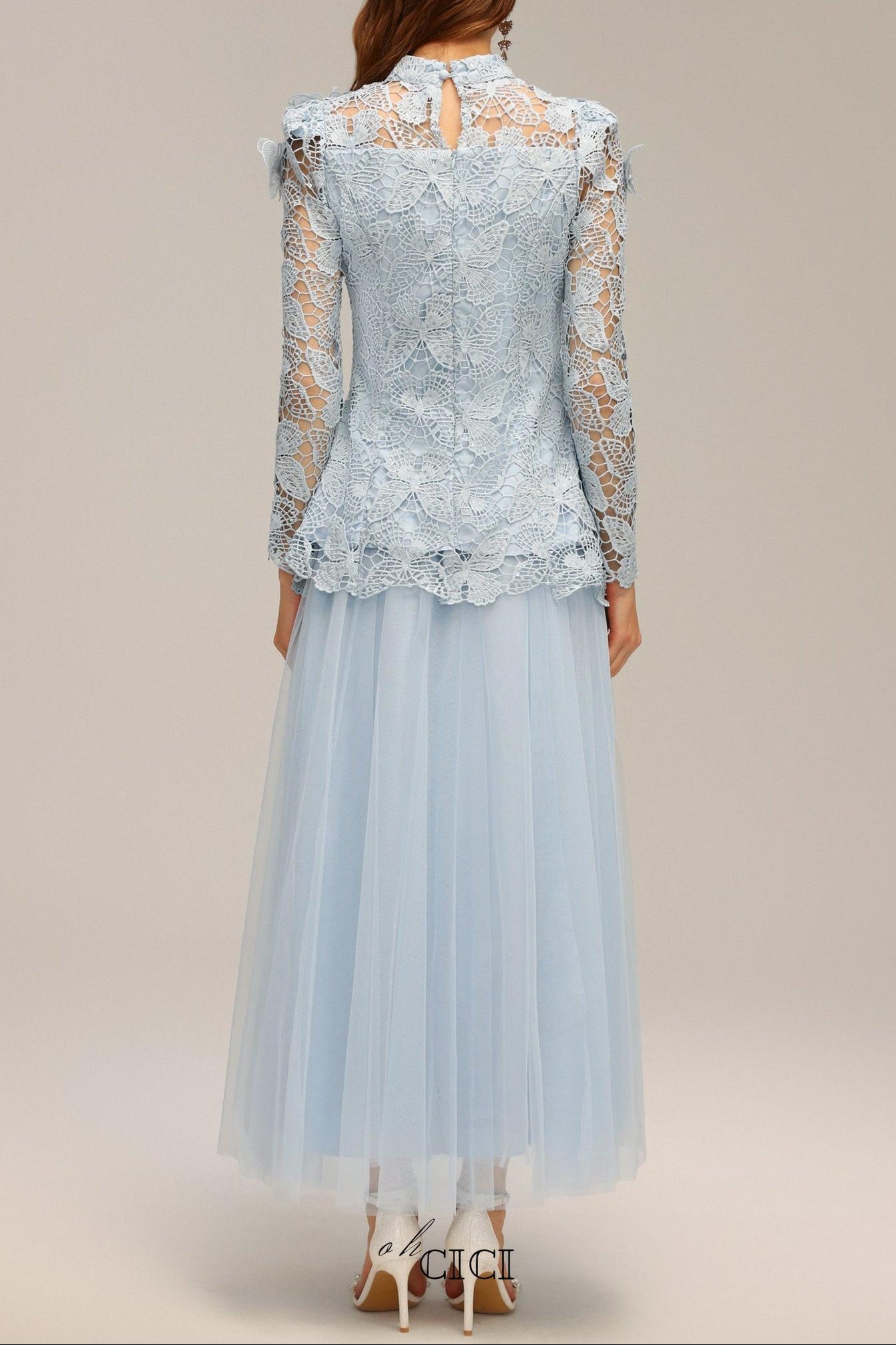 yvette blue Long Sleeve Folds Lace Butterfly Top And Skirt Two-Piece Set