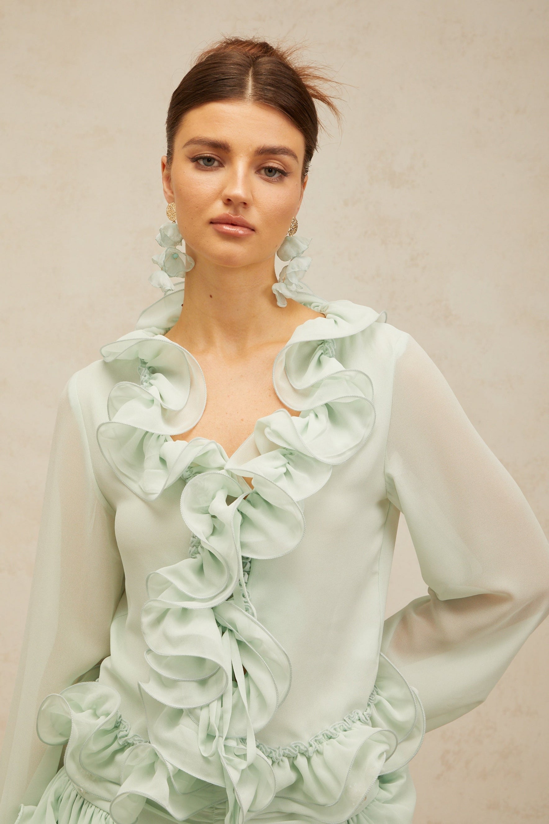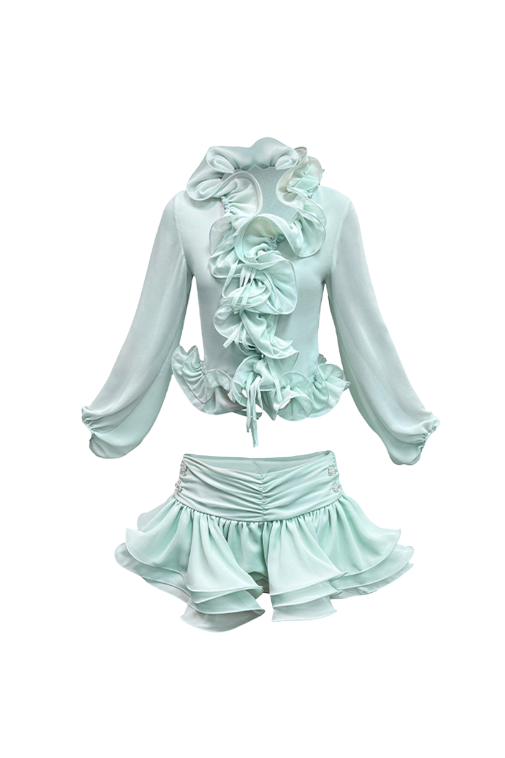 Elevate your wardrobe with this expertly crafted flounced chiffon blouse and skirt matching set in a refreshing mint hue. The lightweight chiffon fabric offers graceful movement and breathability, while the flounced details add a sophisticated, feminine touch. Perfect for both casual and semi-formal occasions, this set combines comfort with elegant style, making it a versatile addition to your collection.