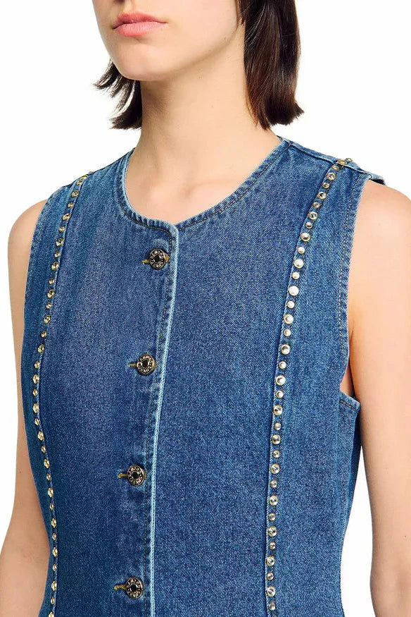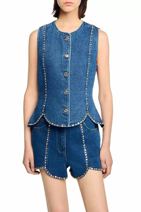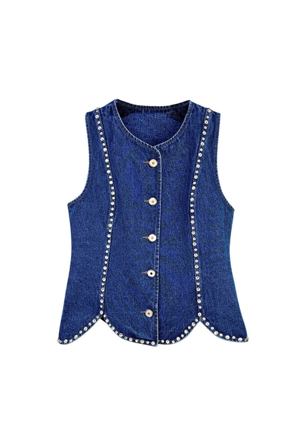 Elevate your wardrobe with the Rhinestone Denim Top in Blue, expertly crafted to combine classic denim durability with a touch of sparkling sophistication. This top features carefully placed rhinestones that add subtle glamour without compromising comfort or versatility. Ideal for both casual and dressier occasions, it offers a refined yet edgy look that enhances your style with expert precision.