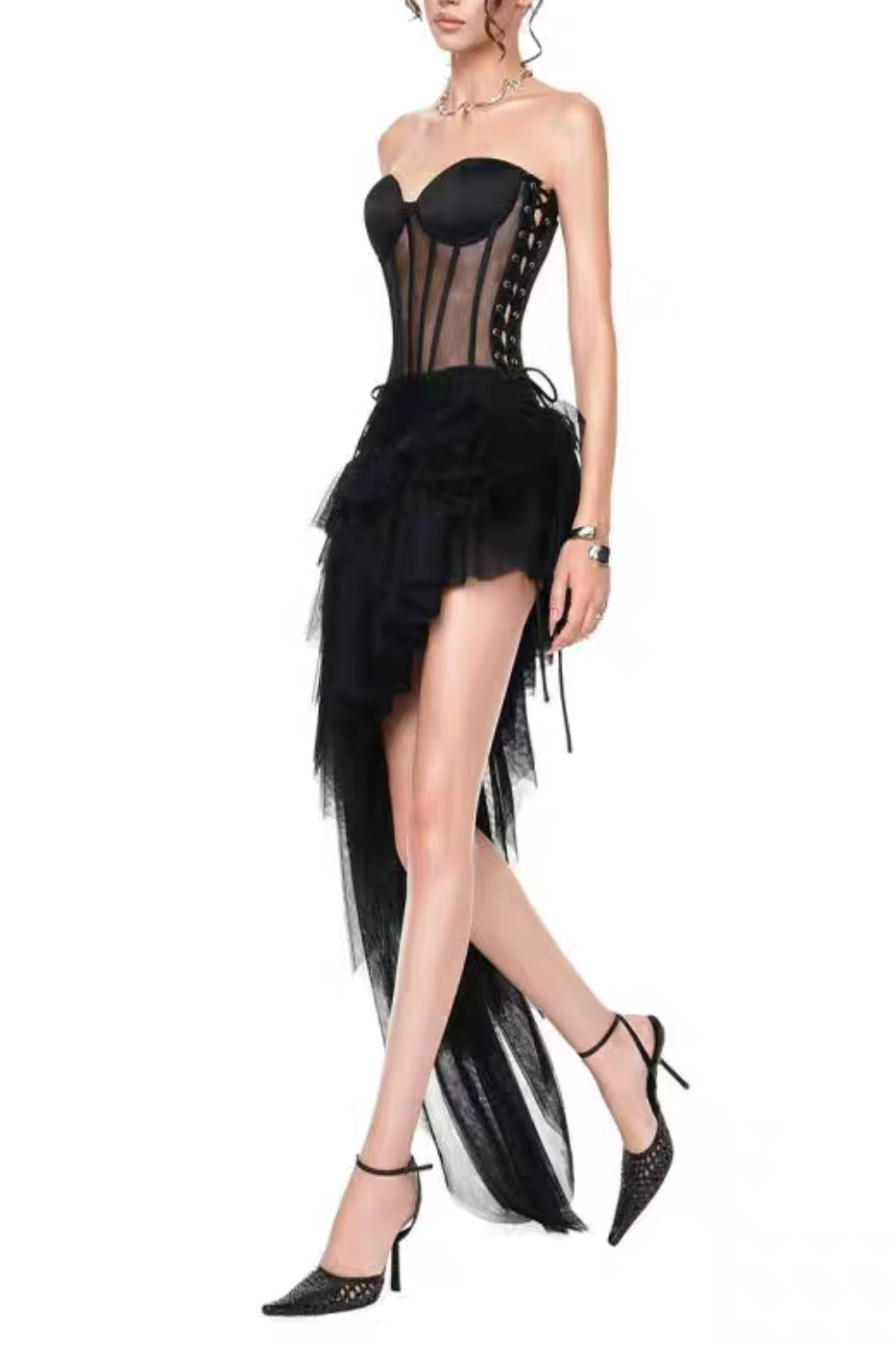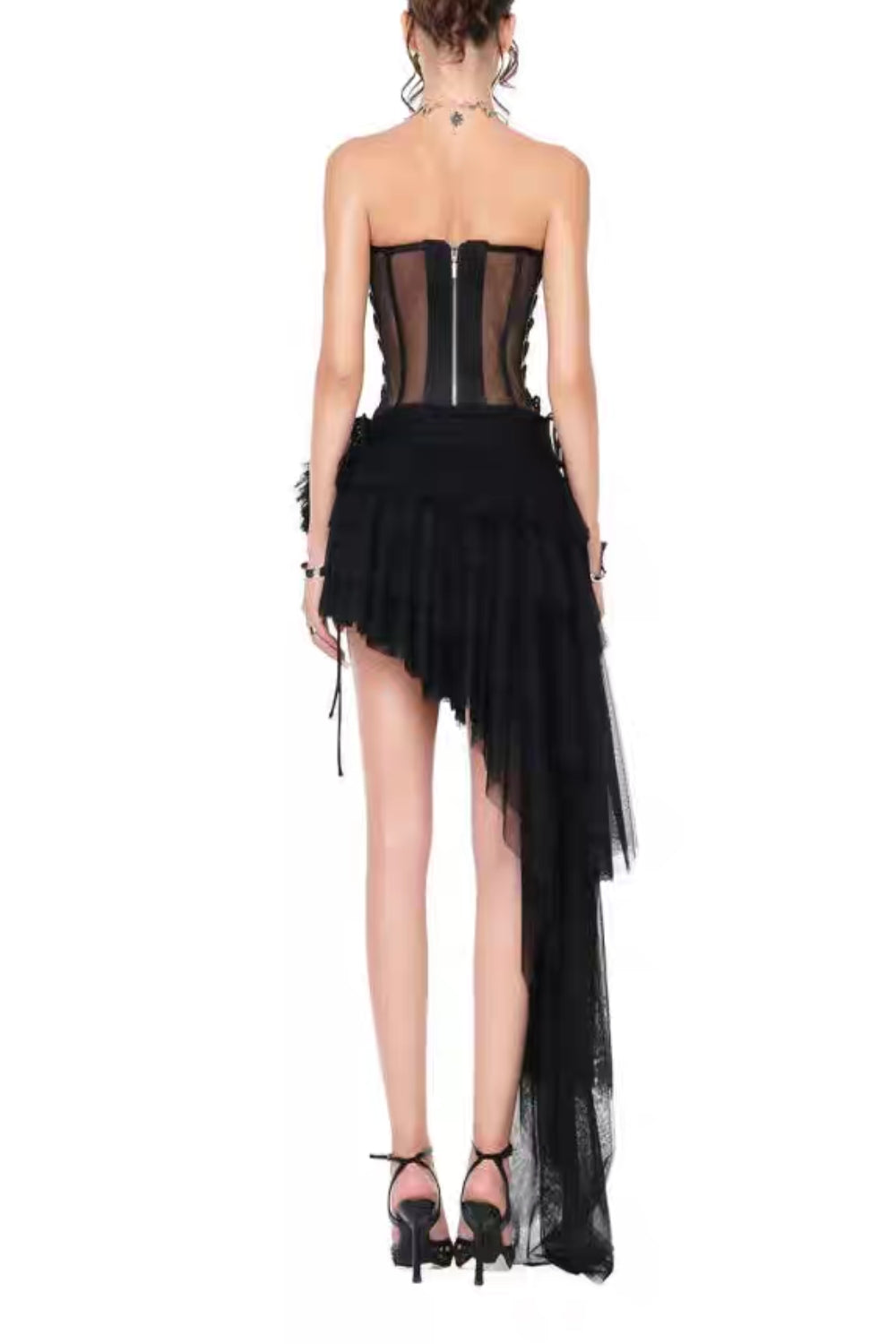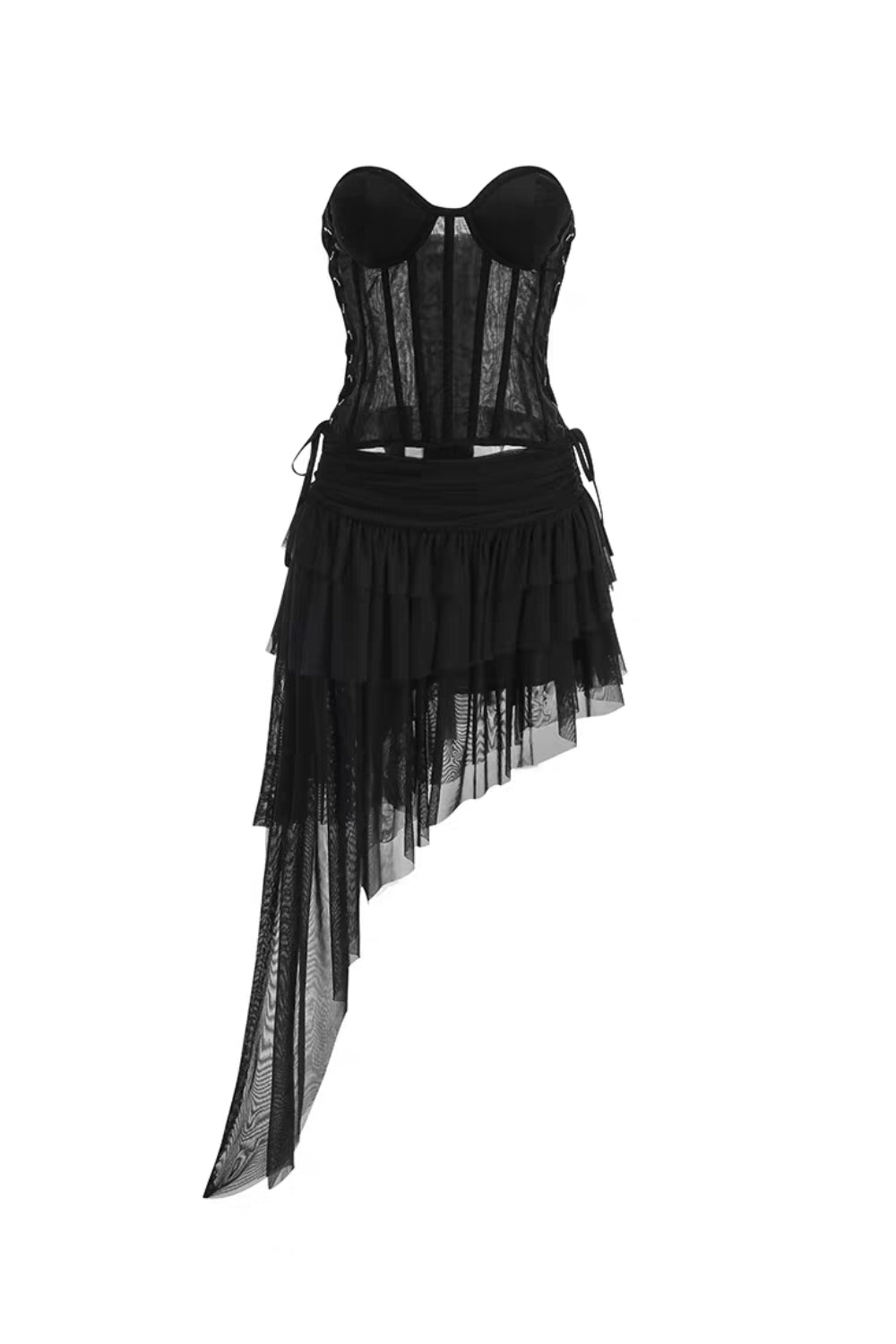 The Black Corset Top & Irregular Mesh Skirt Two Pieces Set is a fierce, fashion-forward ensemble that blends gothic romance with avant-garde edge. This striking two-piece set features a structured corset top with intricate boning and lace-up detailing, paired with a dramatic high-low mesh skirt featuring irregular hemline cutting for a deconstructed, runway-ready look. Perfect for nights out, editorial events, or bold street style moments, this set commands attention with its dark glamour and architectural silhouette.