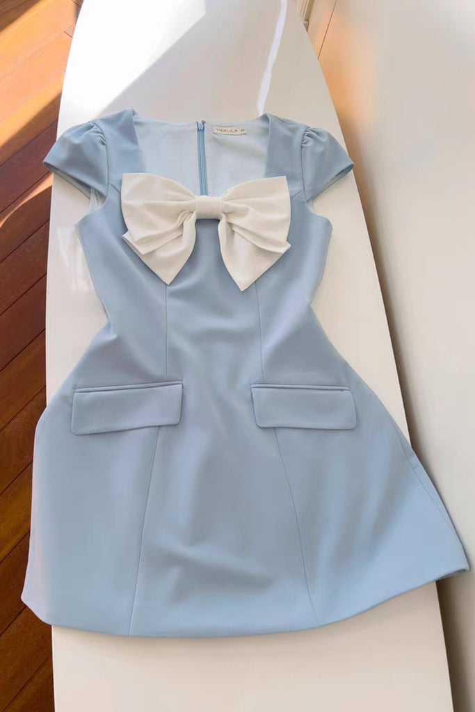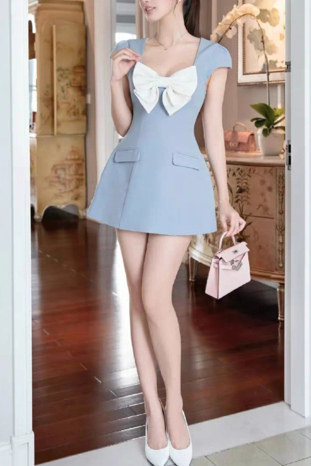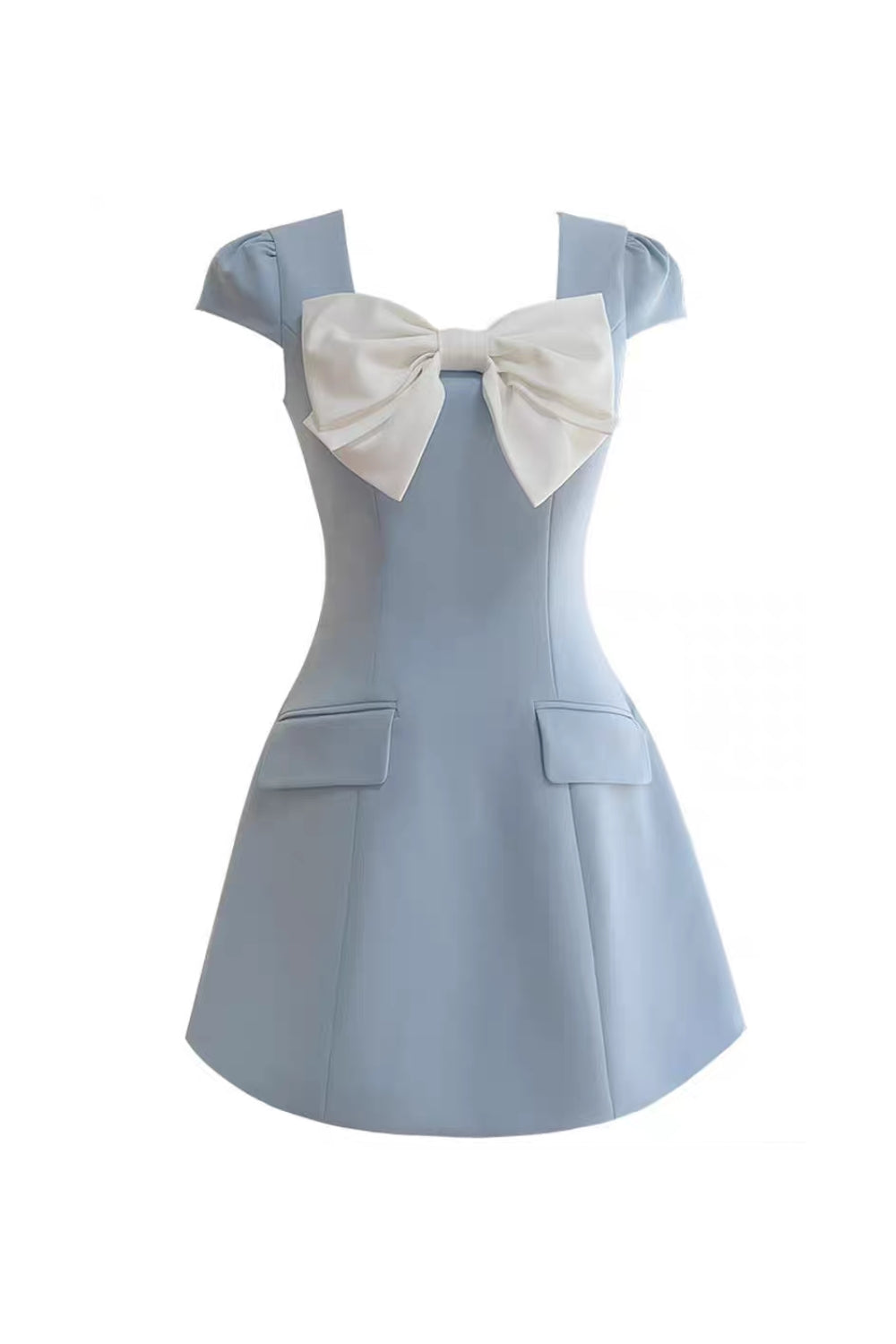 This blue mini dress features a stylish square neckline and short sleeves for a fresh, modern look. Decorative pockets on both sides add subtle detail and practicality, while a white bow accent brings a soft, feminine touch. Designed to keep you comfortable and confident, this dress is a versatile addition to your wardrobe for any occasion.