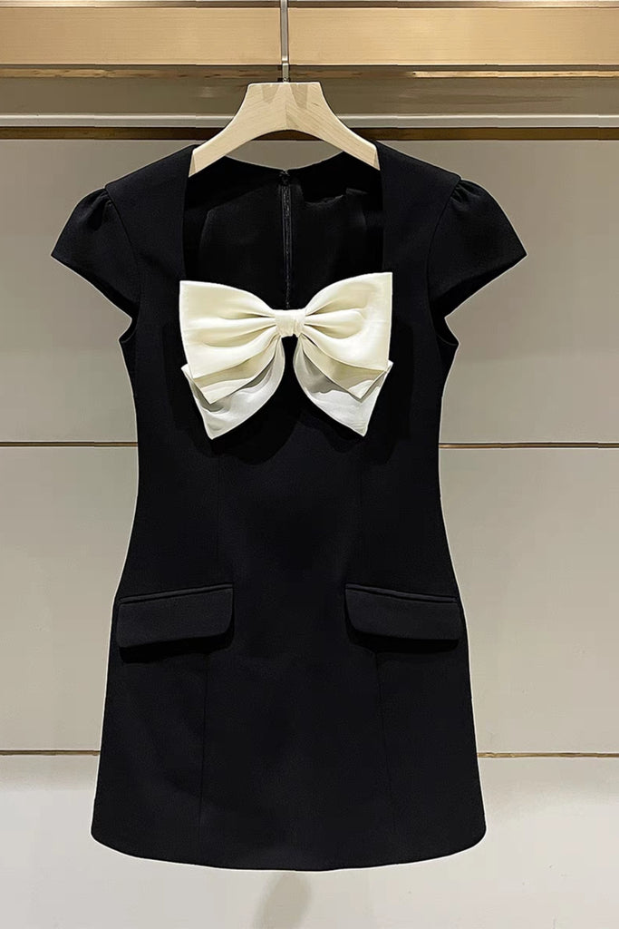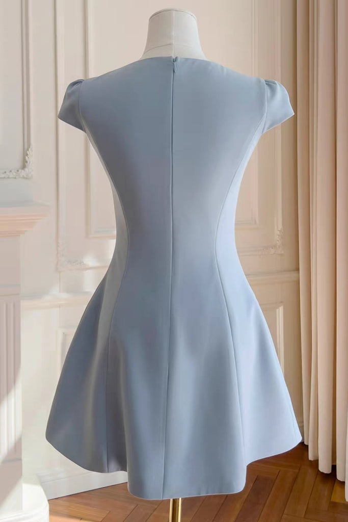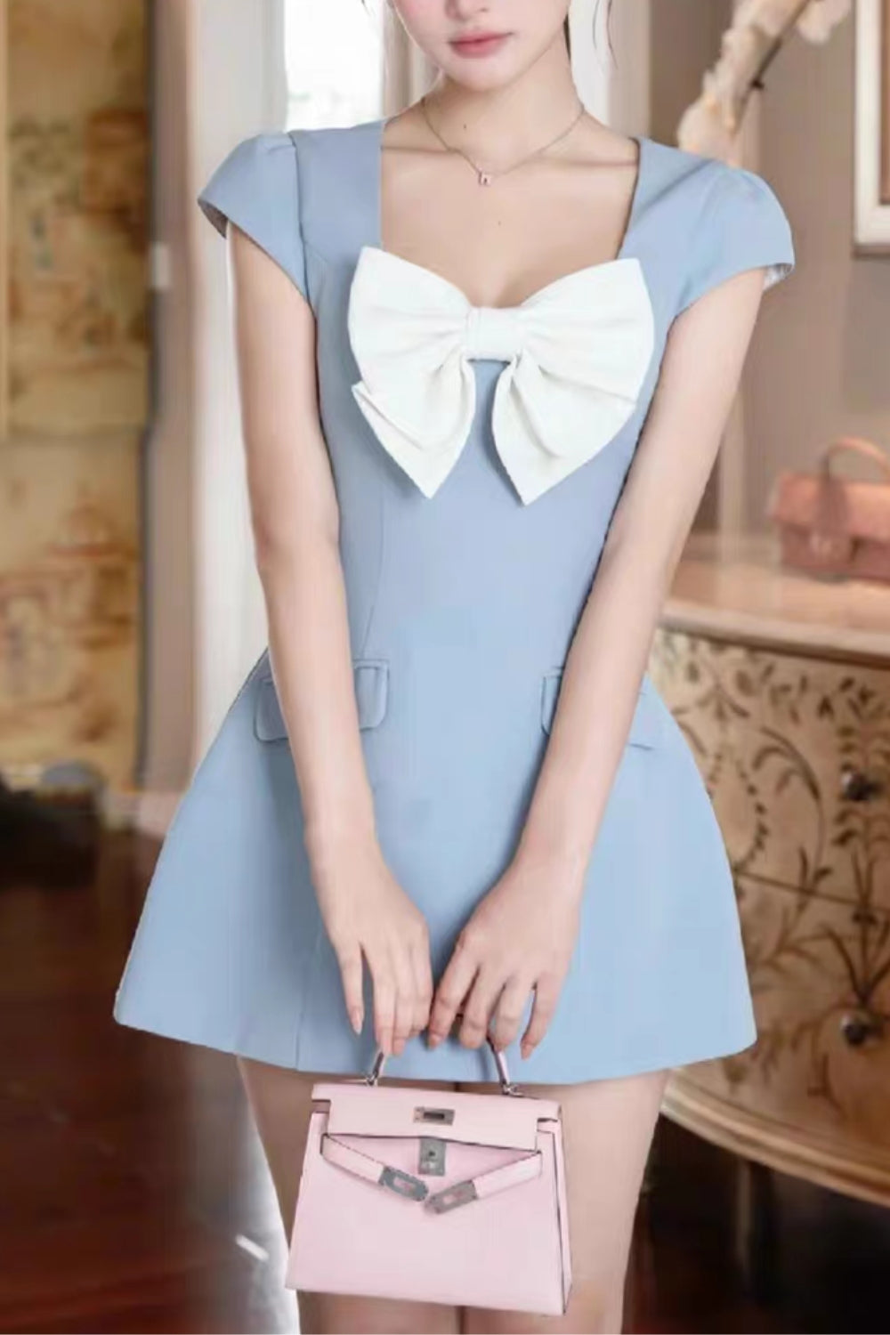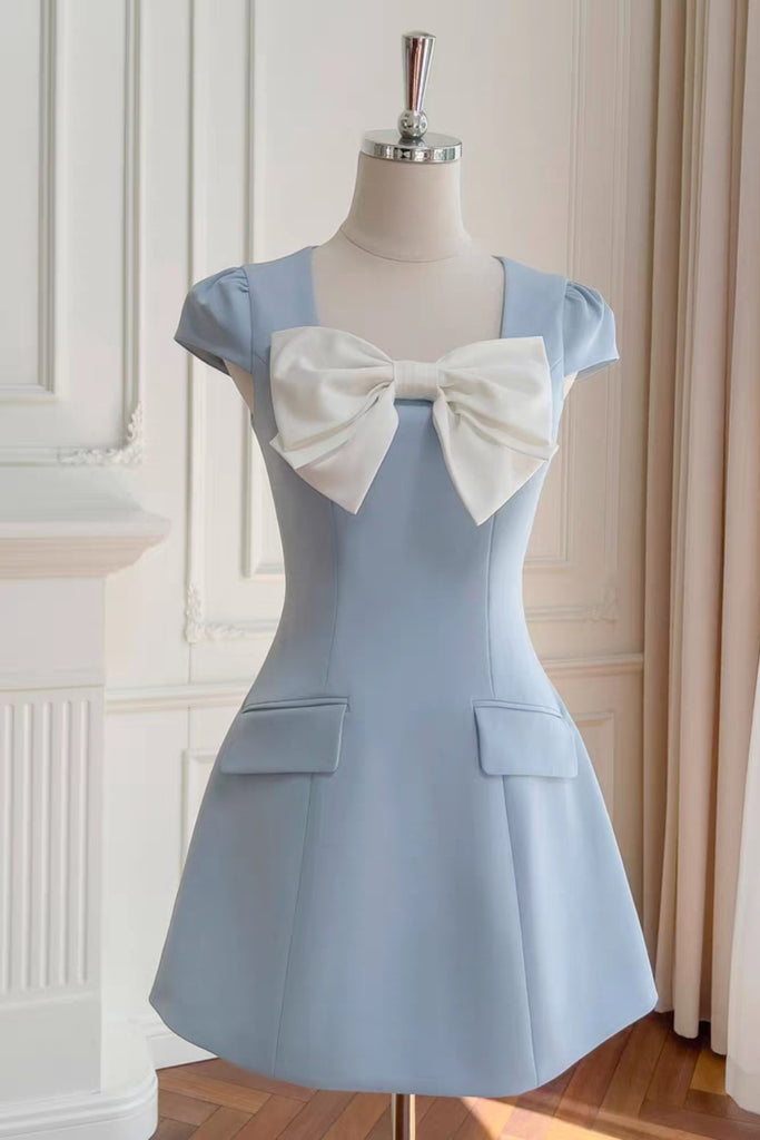 This blue mini dress features a stylish square neckline and short sleeves for a fresh, modern look. Decorative pockets on both sides add subtle detail and practicality, while a white bow accent brings a soft, feminine touch. Designed to keep you comfortable and confident, this dress is a versatile addition to your wardrobe for any occasion.