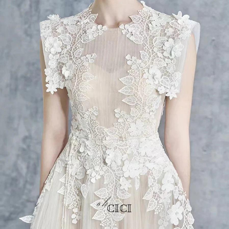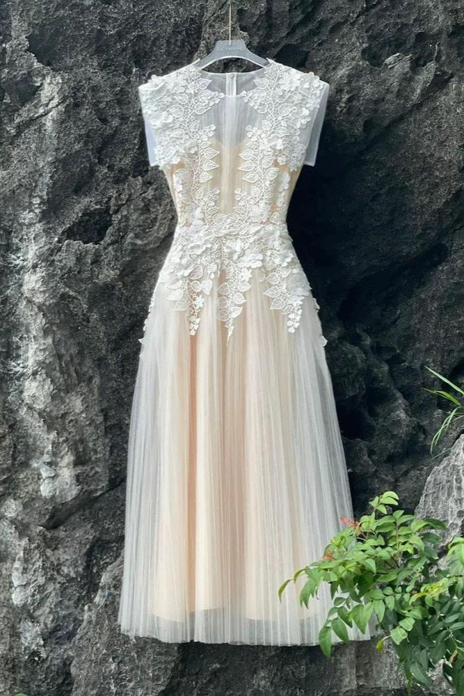 This beige midi dress features a sleeveless design with a delicate floral appliqué bodice, combining elegance and subtle texture. Its tailored fit enhances silhouette definition, making it ideal for formal occasions or sophisticated daytime events. The neutral tone ensures versatile styling options, while the intricate detailing adds a refined, expert touch to your wardrobe.