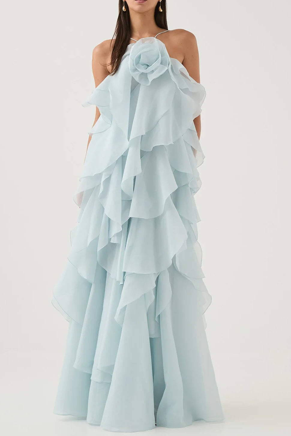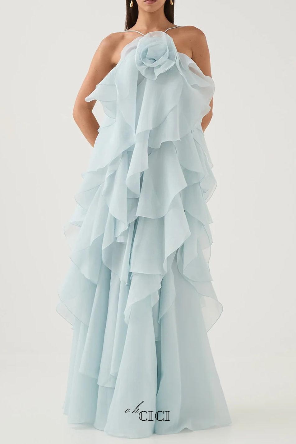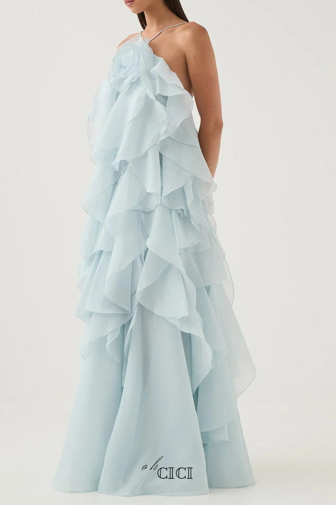 This off-shoulder layered maxi dress in blue features delicate ruffle detailing that adds dimension and movement. Its flowing silhouette offers an elegant, breathable fit ideal for warm weather or special occasions. The off-shoulder design highlights the neckline, combining comfort with a sophisticated, feminine style. Perfect for those seeking a refined yet effortless look.