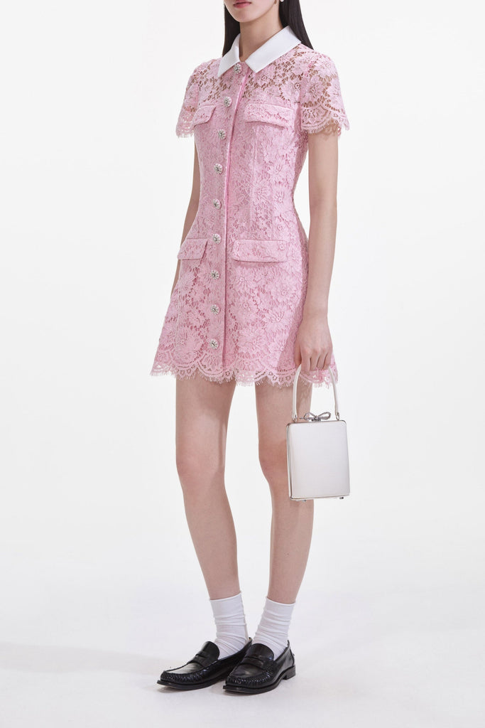 The iconic lace dress gets a preppy makeover, courtesy of a contrast revere collar and short structured sleeves. Diamanté buttons add extra sparkle – match the shine with our statement earrings.