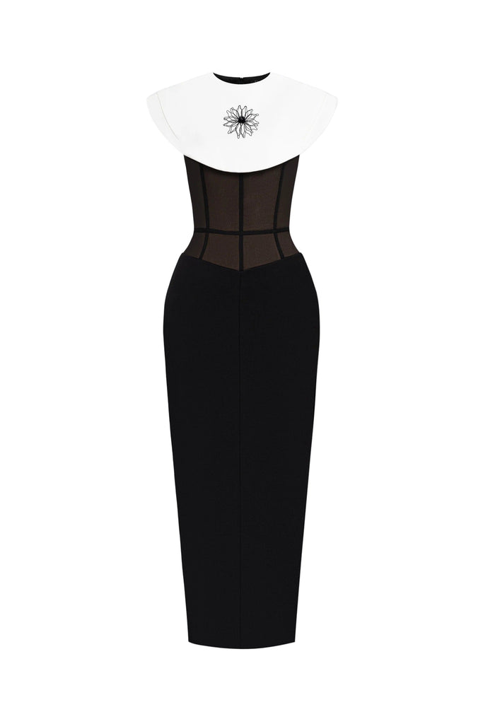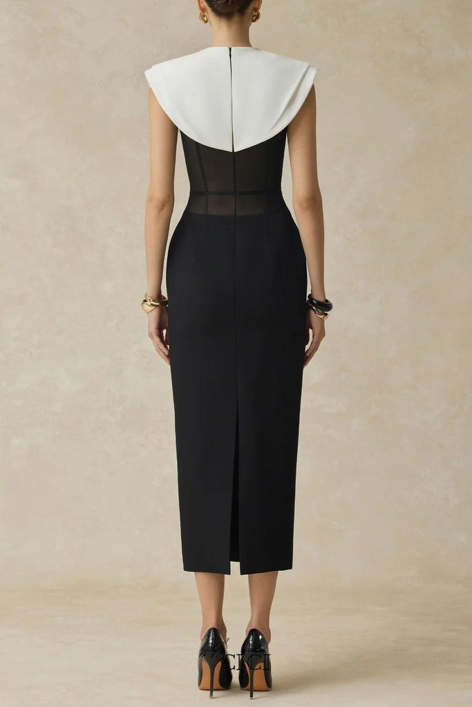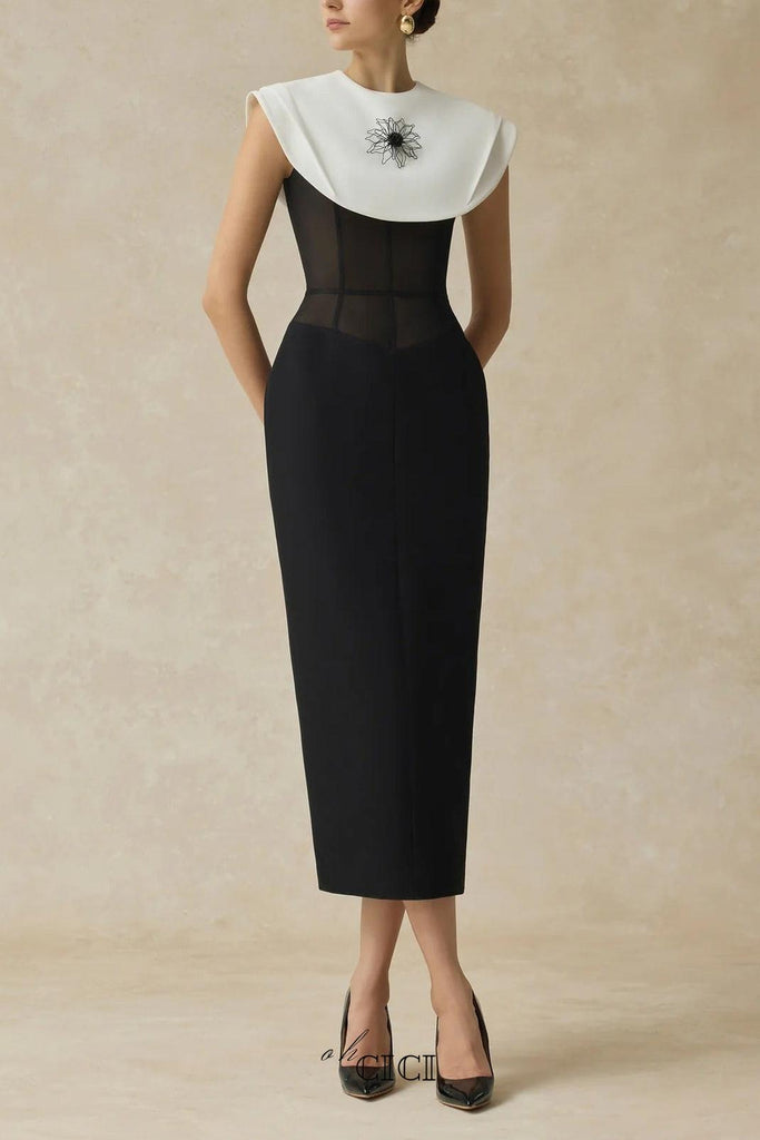 Elevate your wardrobe with the Bernice black sleeveless midi dress, designed for timeless elegance and refined style. This dress features a sleek, form-flattering silhouette that hits at midi length, complemented by a striking white cape that adds a sophisticated contrast and graceful movement. Perfect for formal events and upscale occasions, this dress combines classic tailoring with a modern edge, ensuring you make a confident, polished impression.