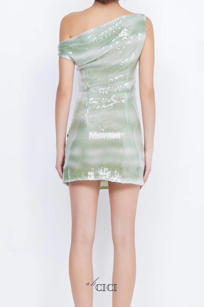 Asymmetric Shoulder Detail, Ombre Sequin Pattern, Mini Length.