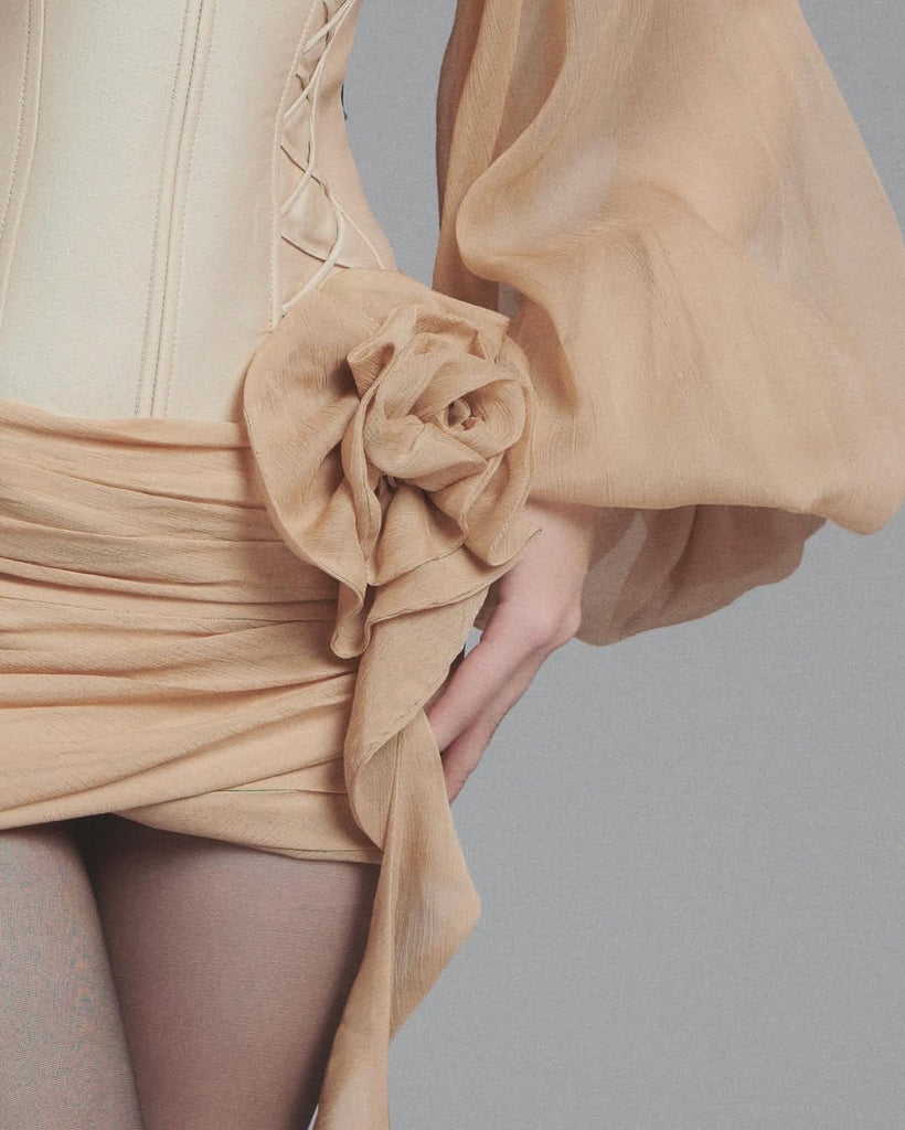 Expertly crafted with delicate floral appliques, this corset mini dress in nude is a stunning addition to any wardrobe. The intricate detailing and figure-flattering silhouette make it perfect for special occasions or a night out. Elevate your style with this elegant and unique piece.