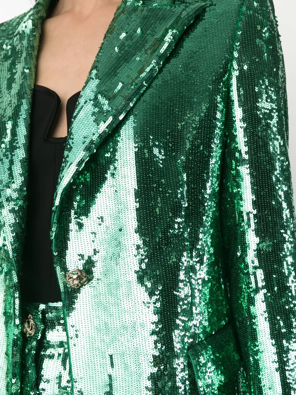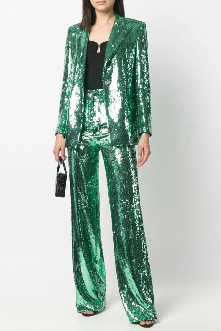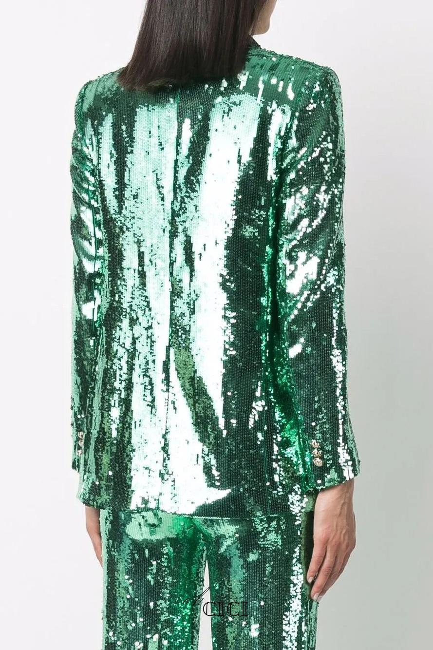 The Florence blazer elevates any ensemble with its sophisticated silhouette and eye-catching sequin embellishments. Crafted in a rich green hue, this piece seamlessly transitions from evening events to upscale casual occasions. The sequins catch light beautifully, adding dimension and glamour without overwhelming the tailored structure. Perfect for those seeking a statement layer that commands attention while maintaining refined elegance.