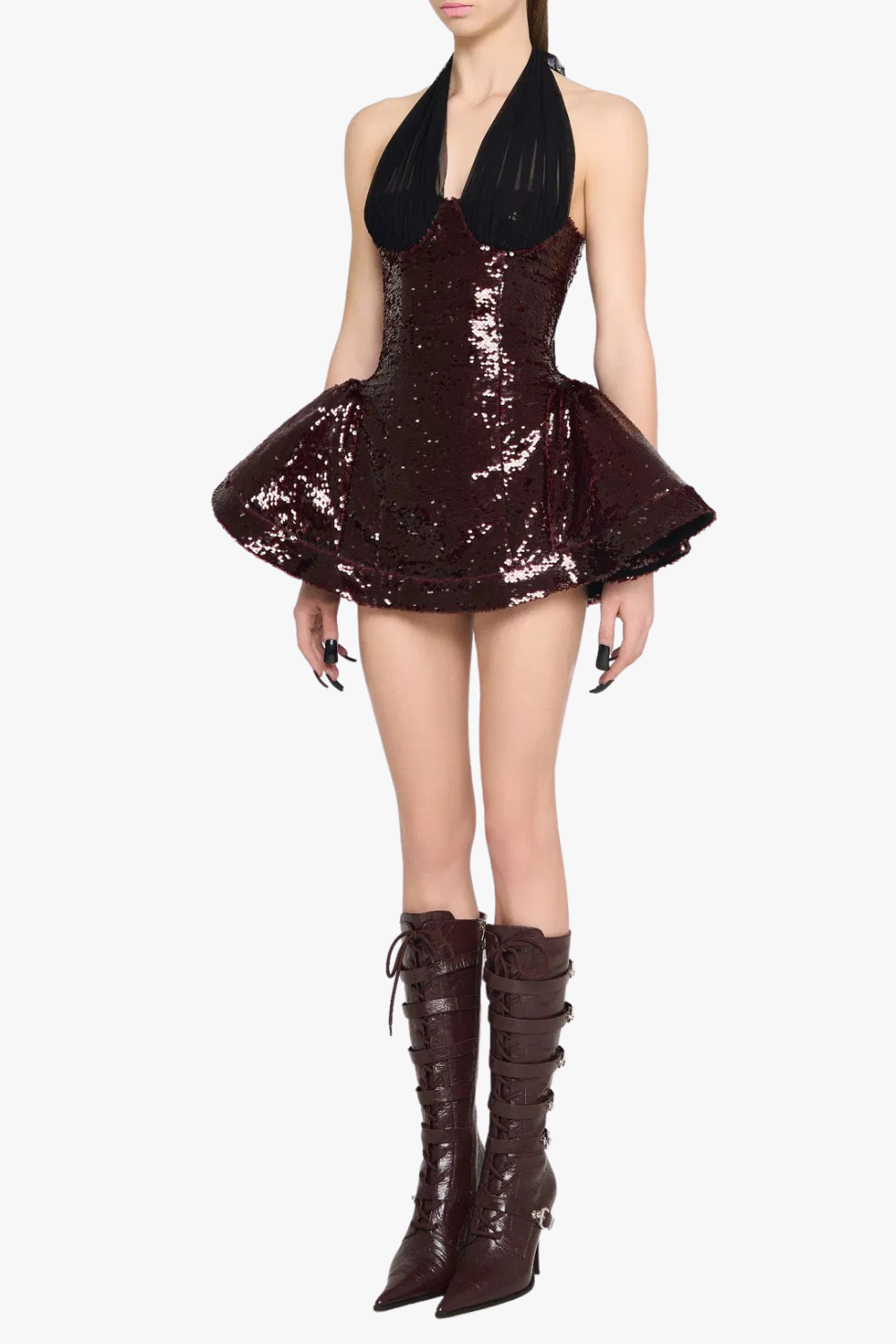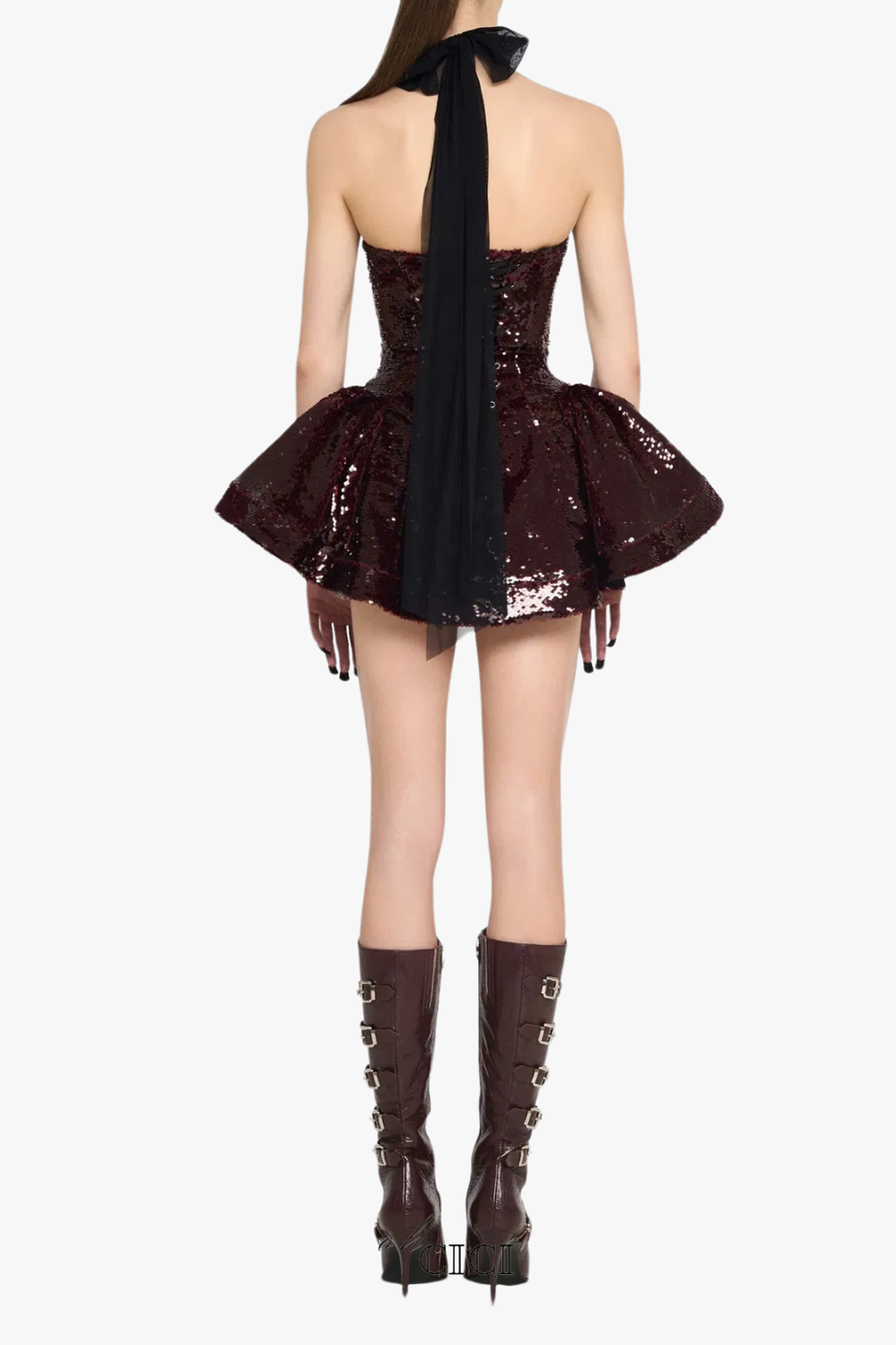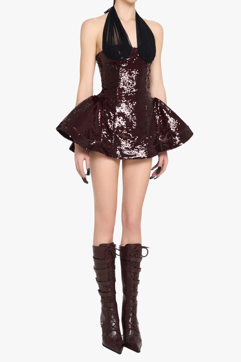 Elevate your evening attire with the Giselle Sequin Halter Mini Dress in rich merlot. This sophisticated piece features a flattering halter neckline and all-over sequin embellishment that catches the light with every movement. The mini length showcases your legs while the deep wine hue offers versatile styling options for cocktail parties, holiday events, or upscale gatherings.