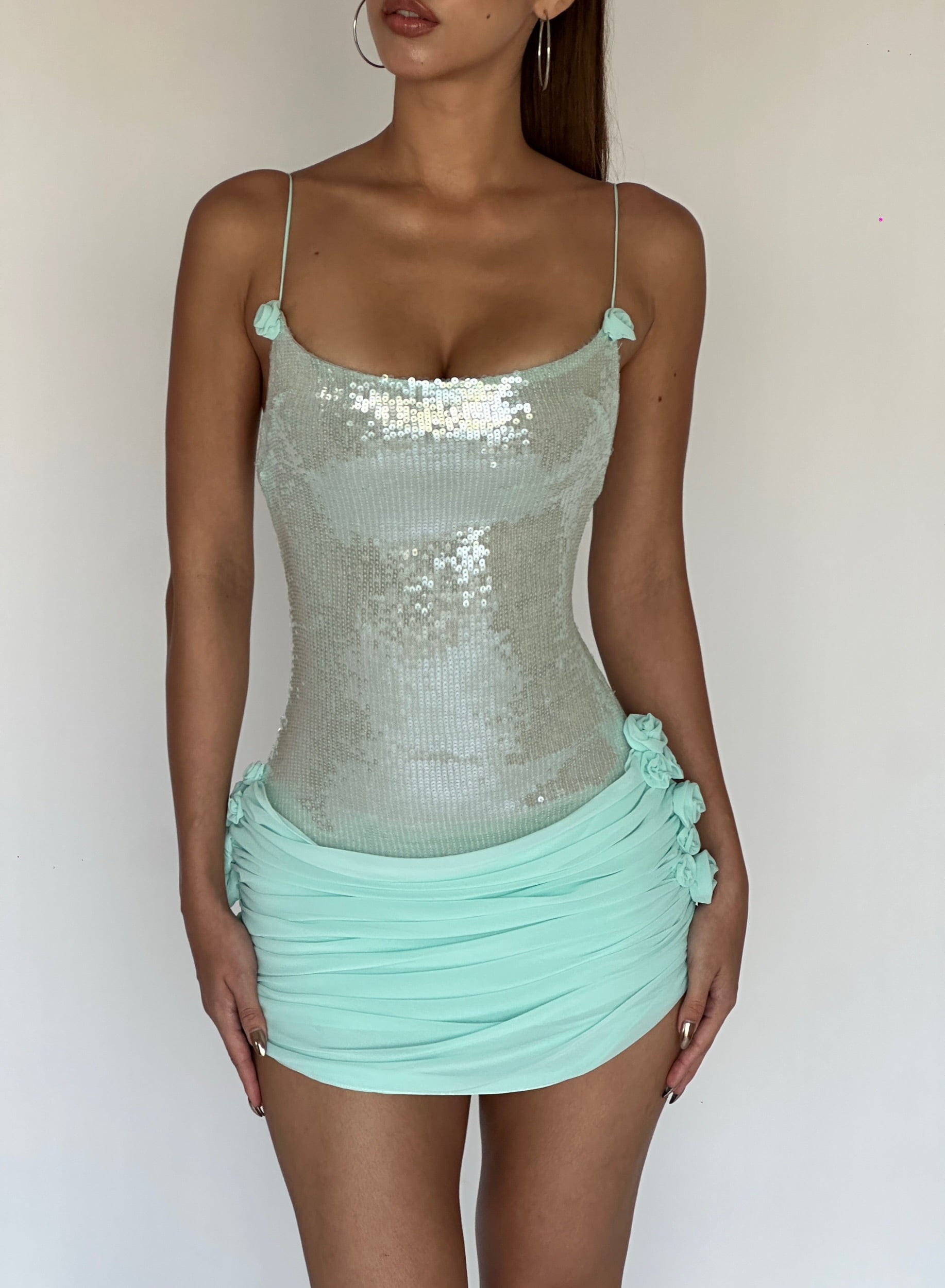 Add a pop of sparkle to your wardrobe with the molly Sequin chiffon Mini Dress in mint. The delicate chiffon fabric and intricate sequin detailing create a stunning combination, perfect for any special occasion. With its flattering mini length and timeless design, this dress is a must-have for any fashion-forward individual.
