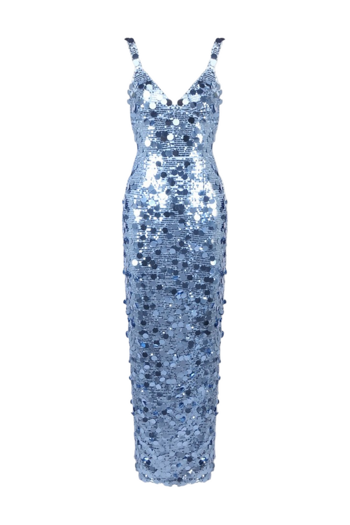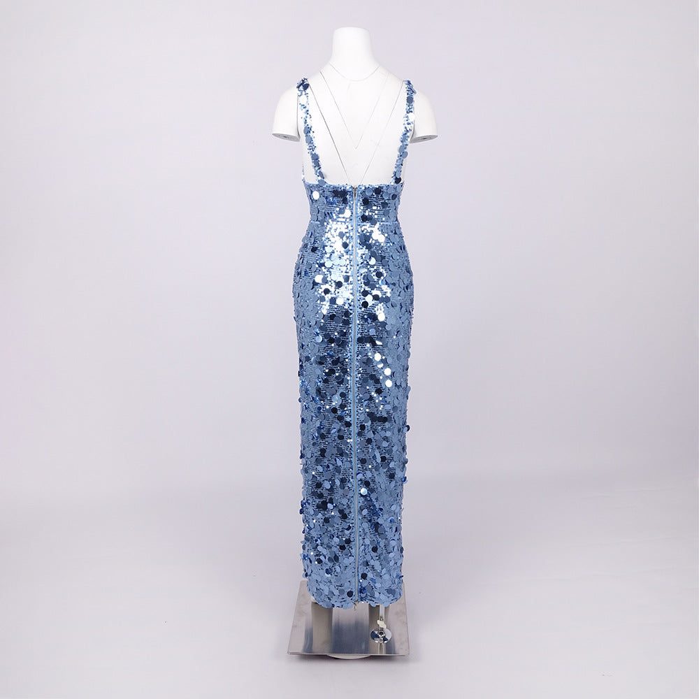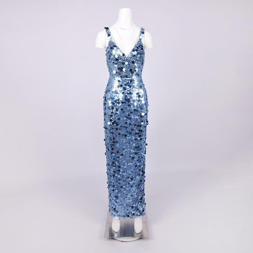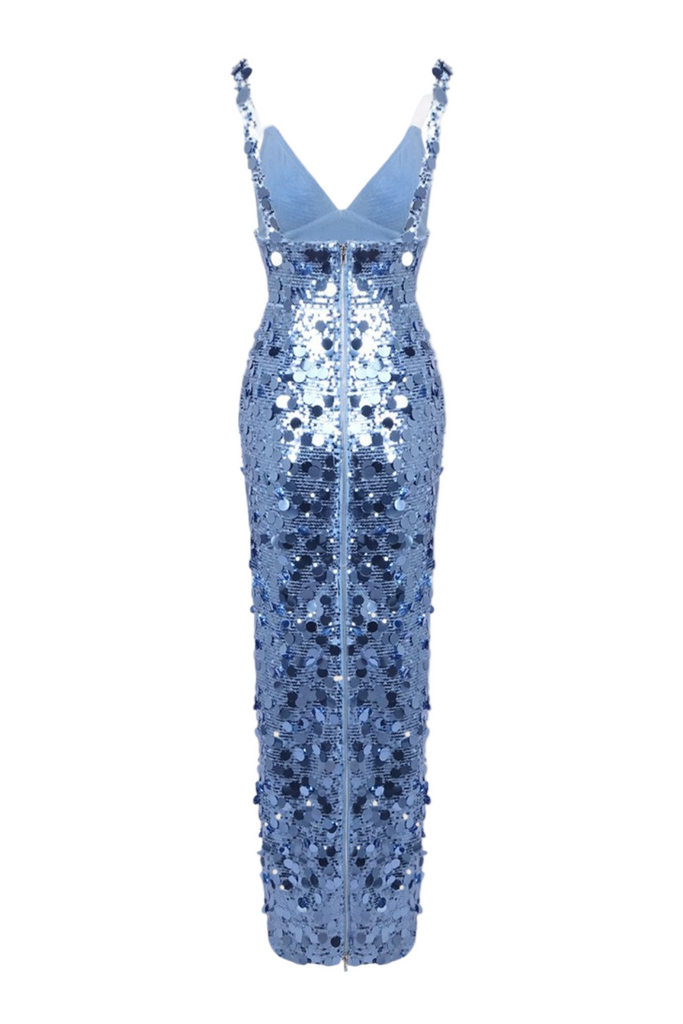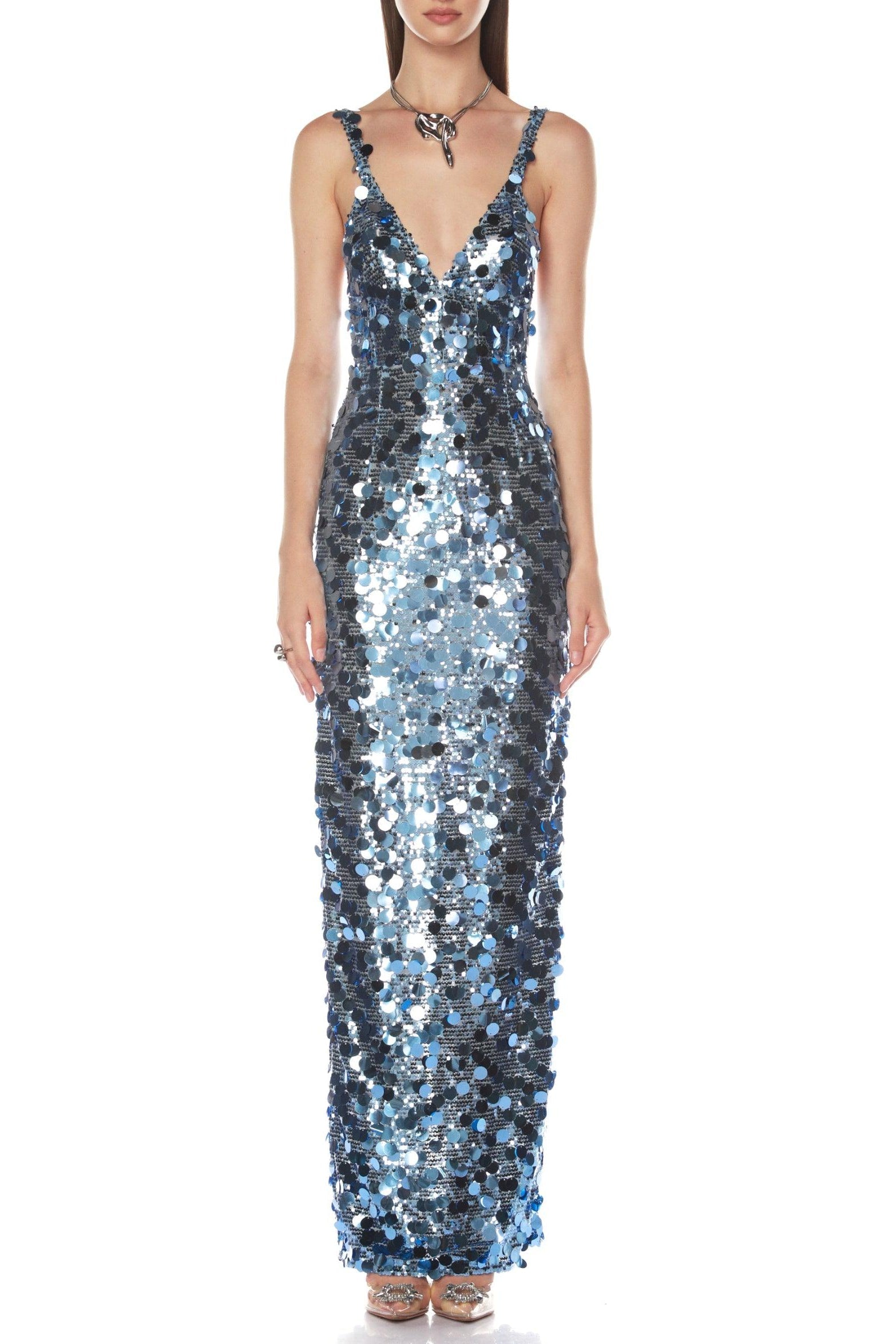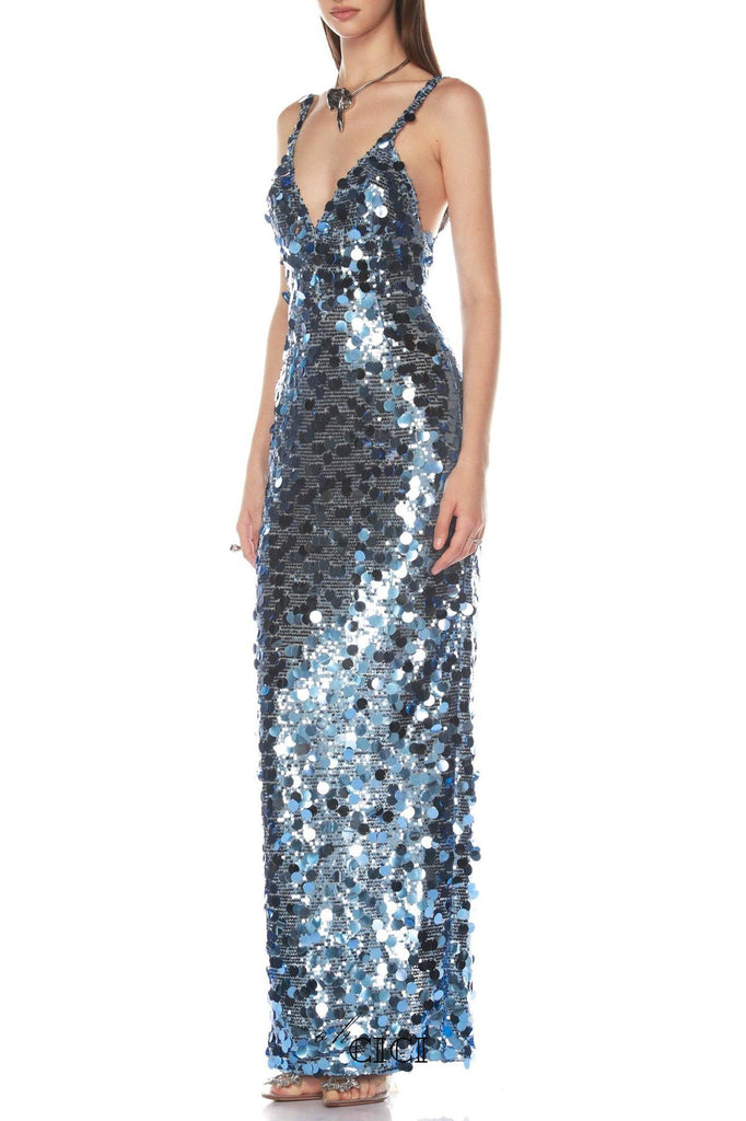 The Roberta Deep V-Neck Sequin Column Gown in blue is a striking choice for formal occasions. Its deep V-neckline enhances elegance, while the column silhouette offers a sleek, elongated look. Adorned with shimmering sequins, this gown catches light beautifully, ensuring you stand out with subtle sophistication. The carefully tailored fit combines comfort with a flattering shape, making it an expert selection for those seeking timeless glamour in evening wear.