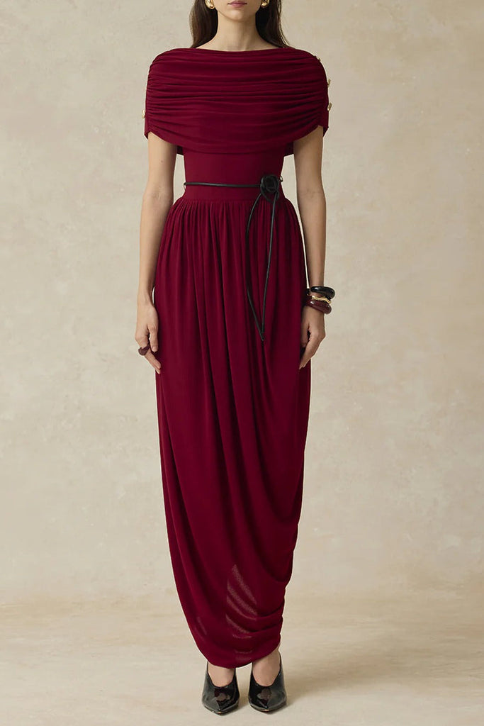 bonnie long sleeve pleated knot bodycon maxi dress in red