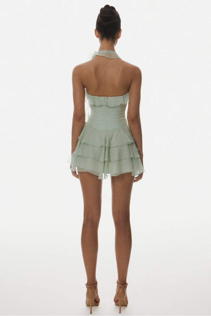 Elevate your wardrobe with the Kyrie Halter Floral Ruffle Mini Dress in vibrant green. This elegant piece features a flattering halter neckline and delicate floral ruffles that add a touch of refined femininity. Perfect for sophisticated occasions, its mini length balances charm and grace, making it an ideal choice for stylish evenings or special events.