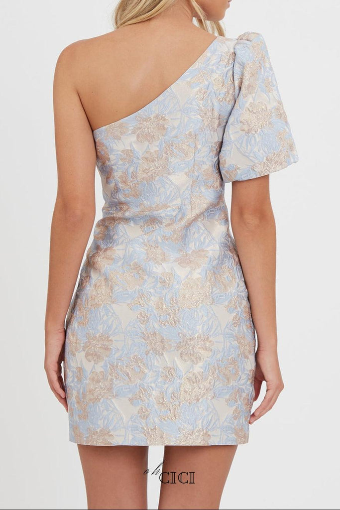 This one-shoulder jacquard mini dress in blue-multi showcases intricate woven patterns that add texture and visual interest. Its asymmetric neckline highlights the shoulder elegantly, while the mini length offers a modern, chic silhouette. Perfect for stylish occasions, this dress combines sophisticated design with a vibrant color palette to make a confident statement.