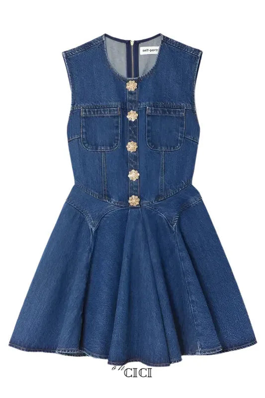 This sleeveless denim mini dress features a charming floral button design in a classic blue shade. Its lightweight fabric and sleeveless cut offer comfort and breathability, making it ideal for warm weather. The mini length adds a youthful, stylish edge, perfect for casual outings or layering with accessories for a polished look. Durable denim ensures lasting wear, while the floral buttons provide a subtle decorative touch that enhances the dress’s overall appeal.