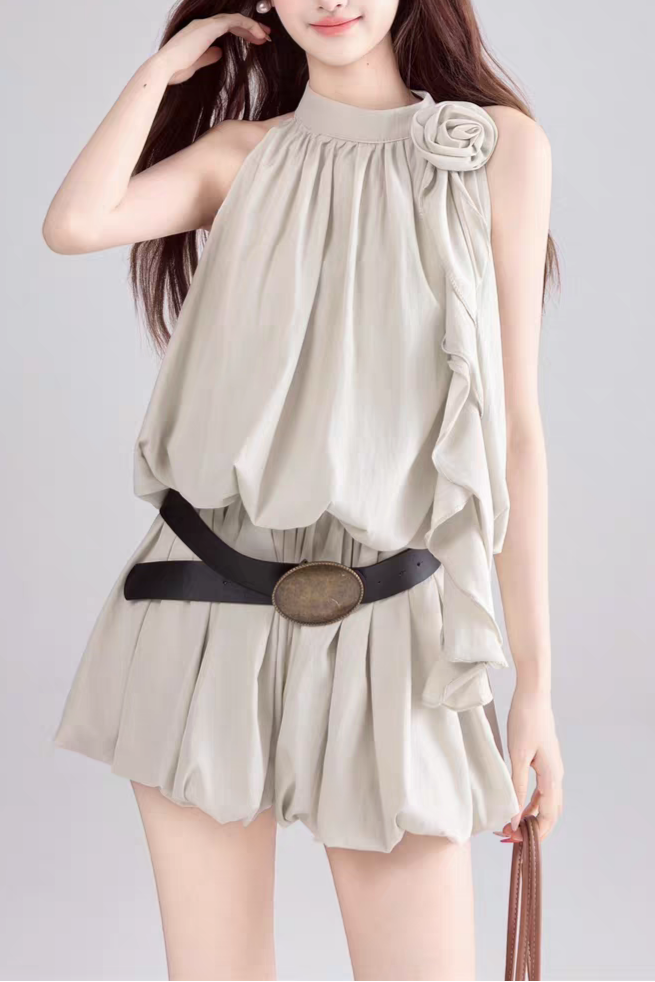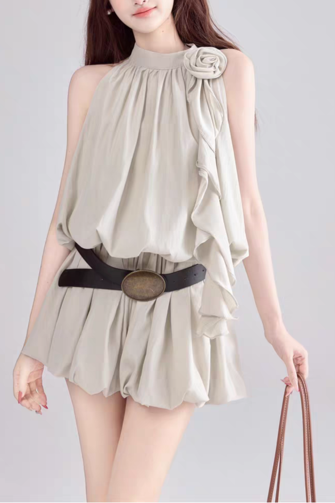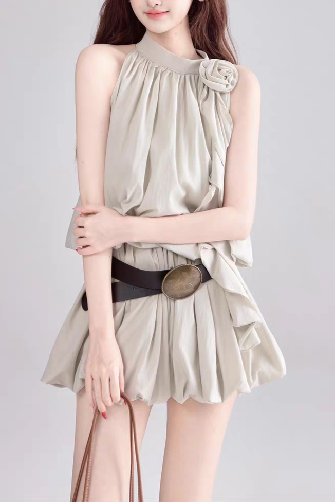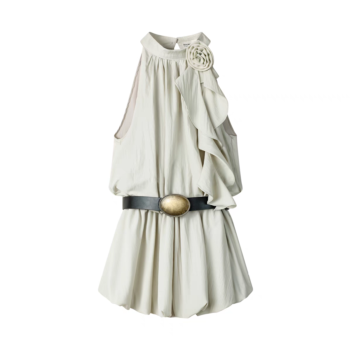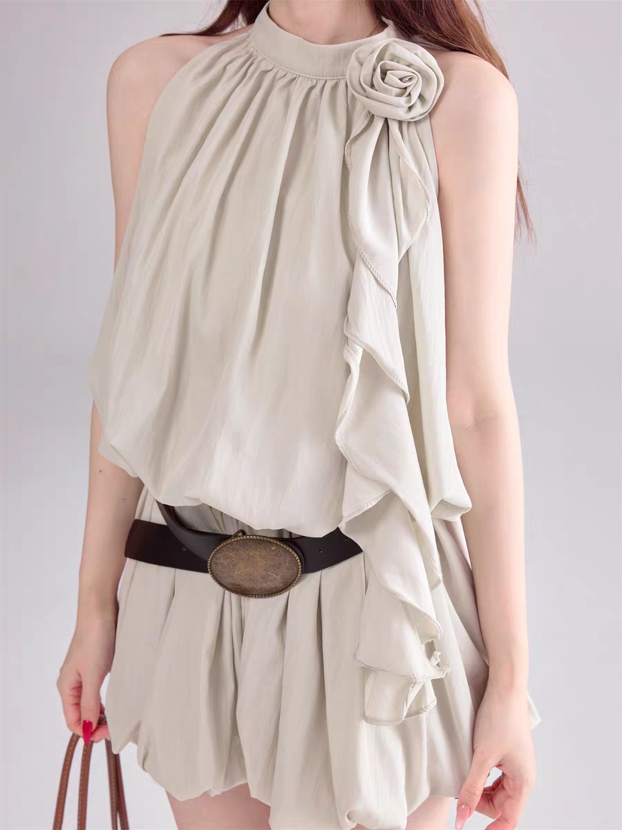 This sleeveless off-shoulder halterneck dress features delicate 3D flowers on the ribbon, adding a charming touch to your look. The waist-cinching belt design enhances your silhouette, providing a flattering fit that boosts confidence and comfort. Perfect for occasions where you want to feel elegant and supported.