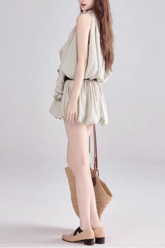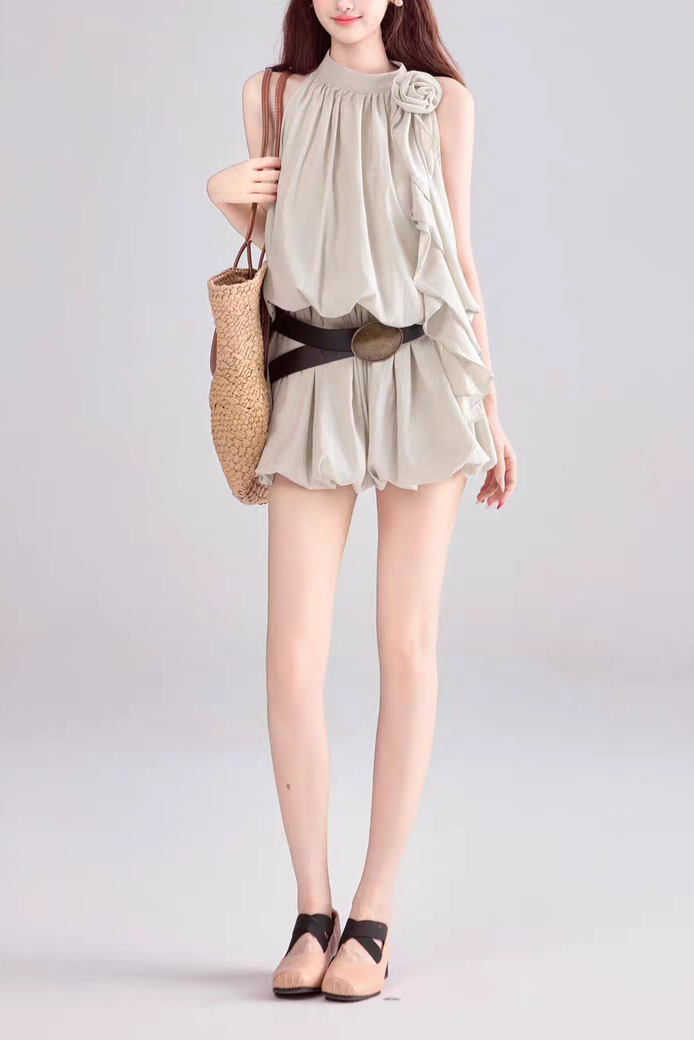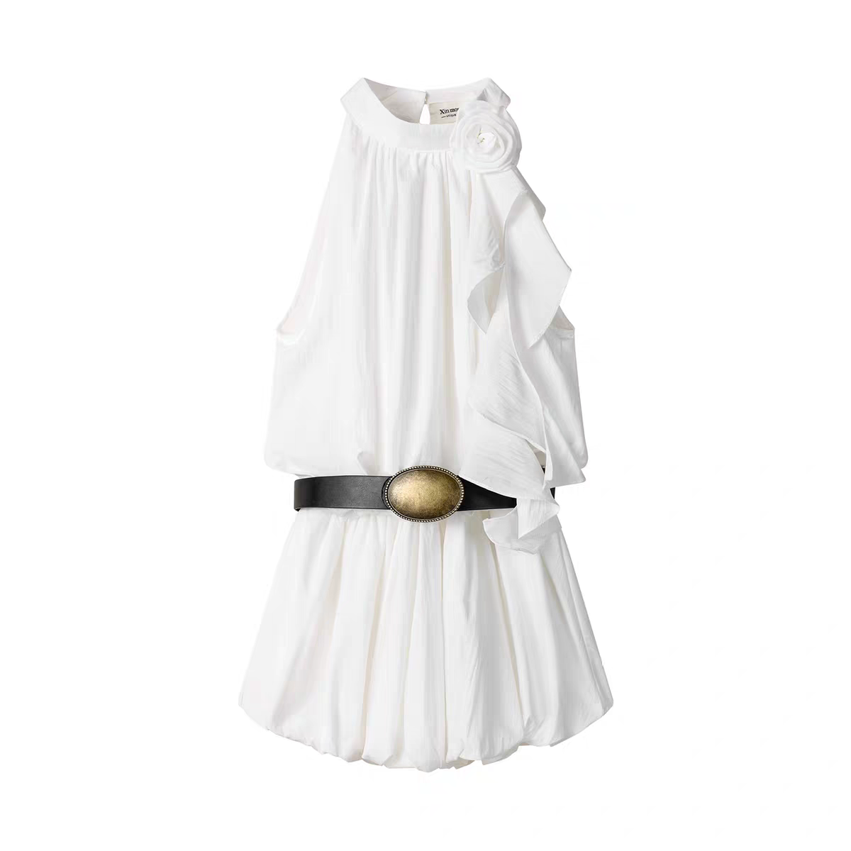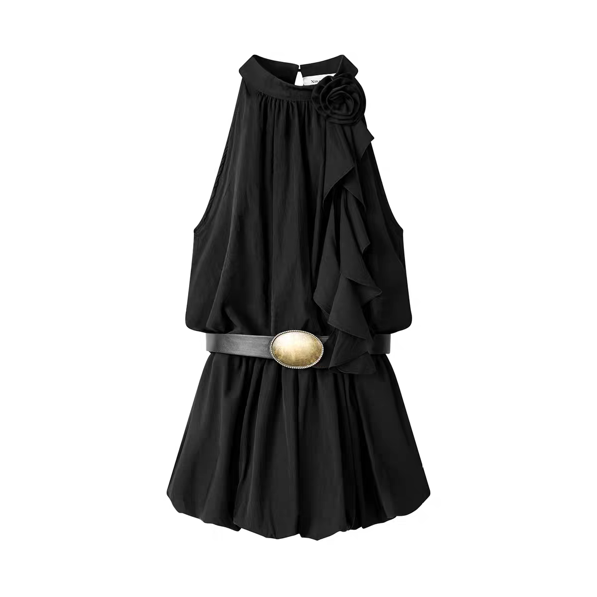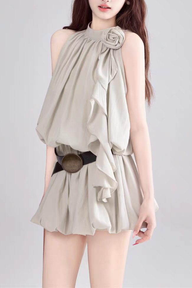 This sleeveless off-shoulder halterneck dress features delicate 3D flowers on the ribbon, adding a charming touch to your look. The waist-cinching belt design enhances your silhouette, providing a flattering fit that boosts confidence and comfort. Perfect for occasions where you want to feel elegant and supported.