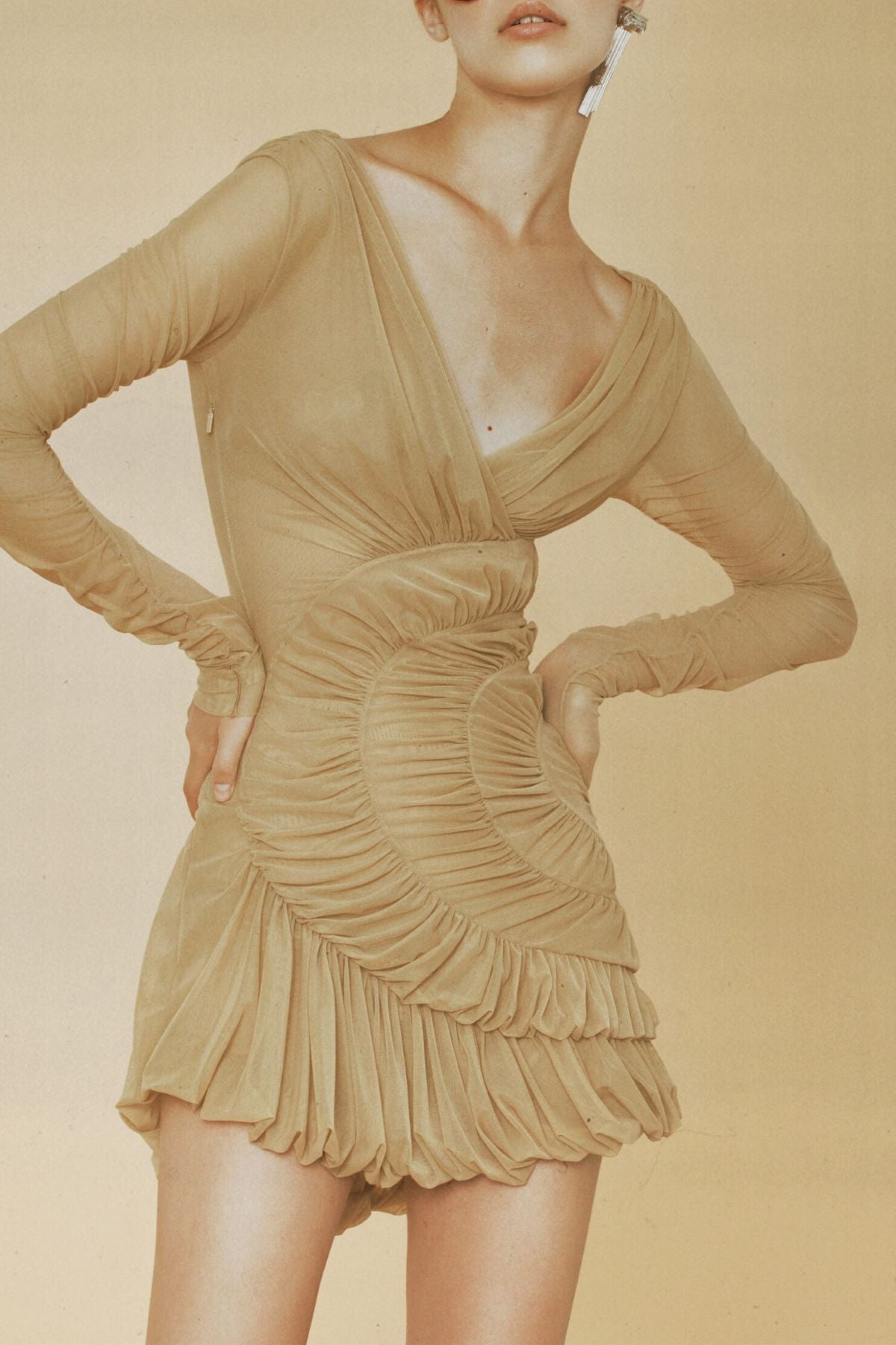 Step out in style with the Lyre Mesh Shirred Mini Dress, where flirty mesh meets playful shirred accents that hug your curves just right. This mini dress adds a cheeky touch to your look, making it perfect for fun nights out or lively daytime adventures. Stay comfortable and confident while turning heads wherever you go.